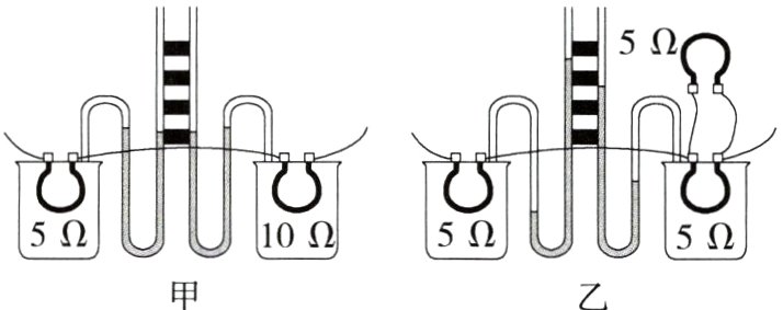 (1)甲装置中,两容器中的电阻丝串联,通过它们的电流与通电时间相同,电阻不同,可探究导体产生的热量与电阻的关系;