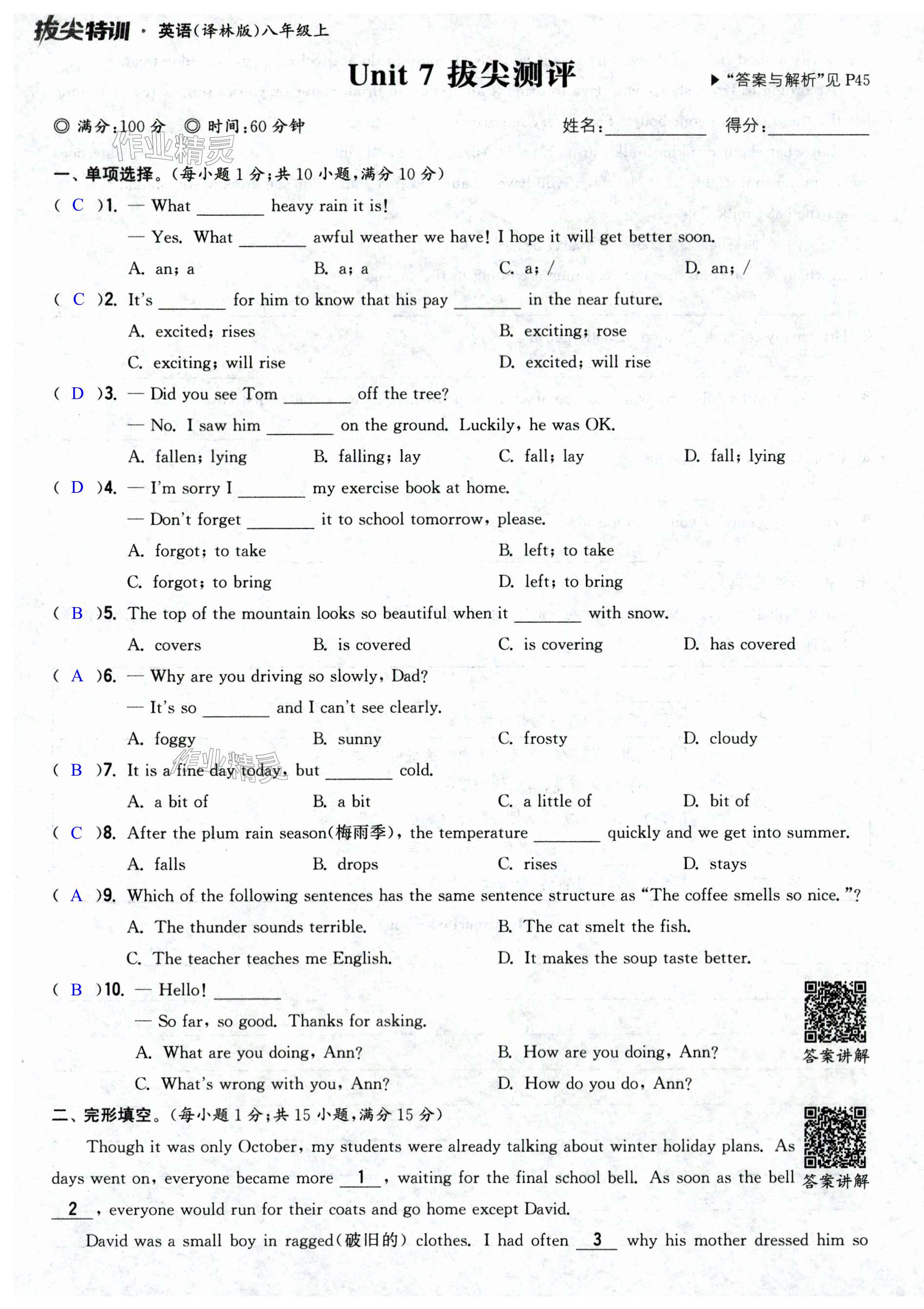 注:目前有些书本章节名称可能整理的还不是很完善,但都是按照顺序排列的,请同学们按照顺序仔细查找。练习册 2024年拔尖特训八年级英语上册译林版 答案主要是用来给同学们做完题方便对答案用的,请勿直接抄袭。