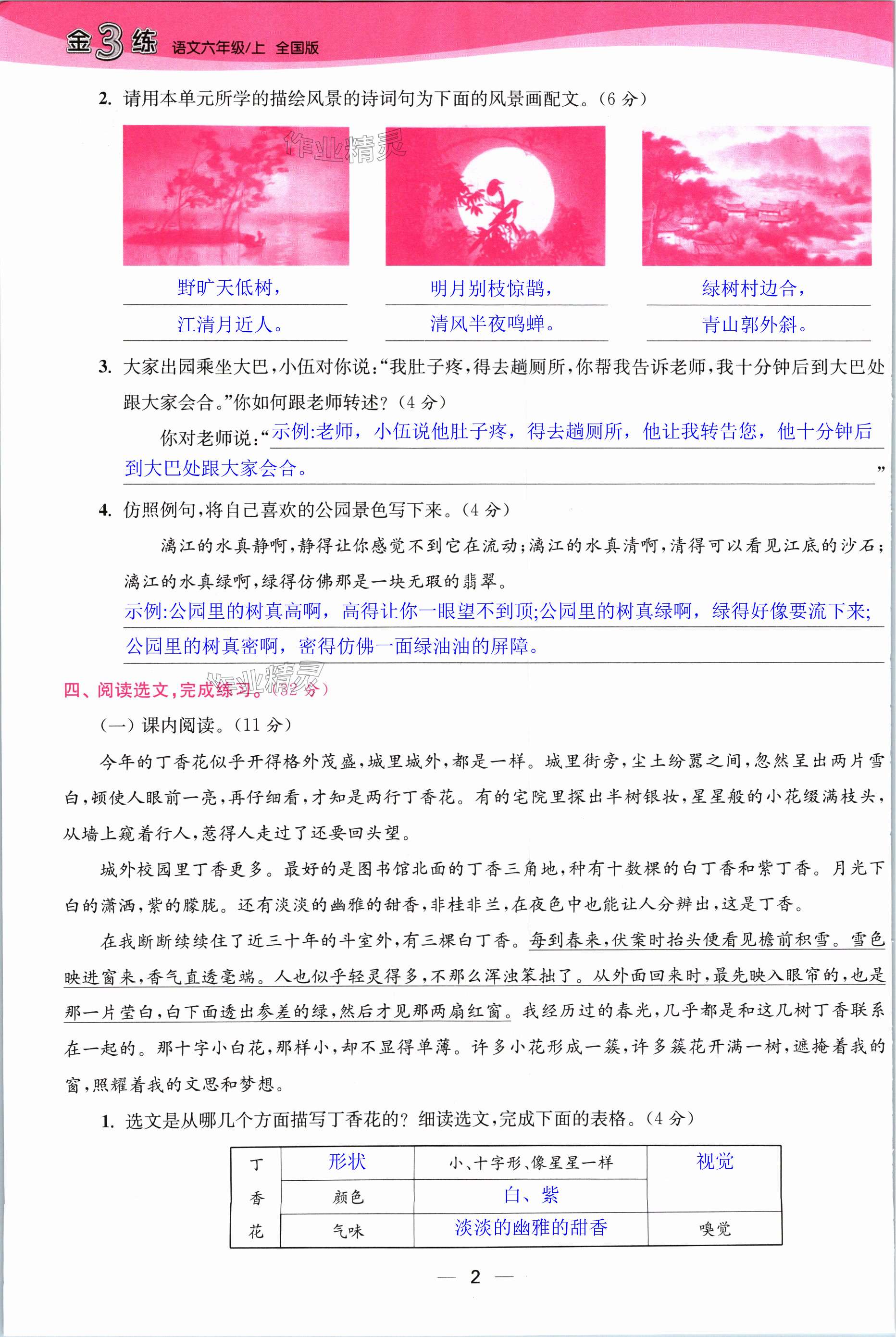 注:目前有些书本章节名称可能整理的还不是很完善,但都是按照顺序排列的,请同学们按照顺序仔细查找。练习册 2024年新编金3练六年级语文上册人教版 答案主要是用来给同学们做完题方便对答案用的,请勿直接抄袭。