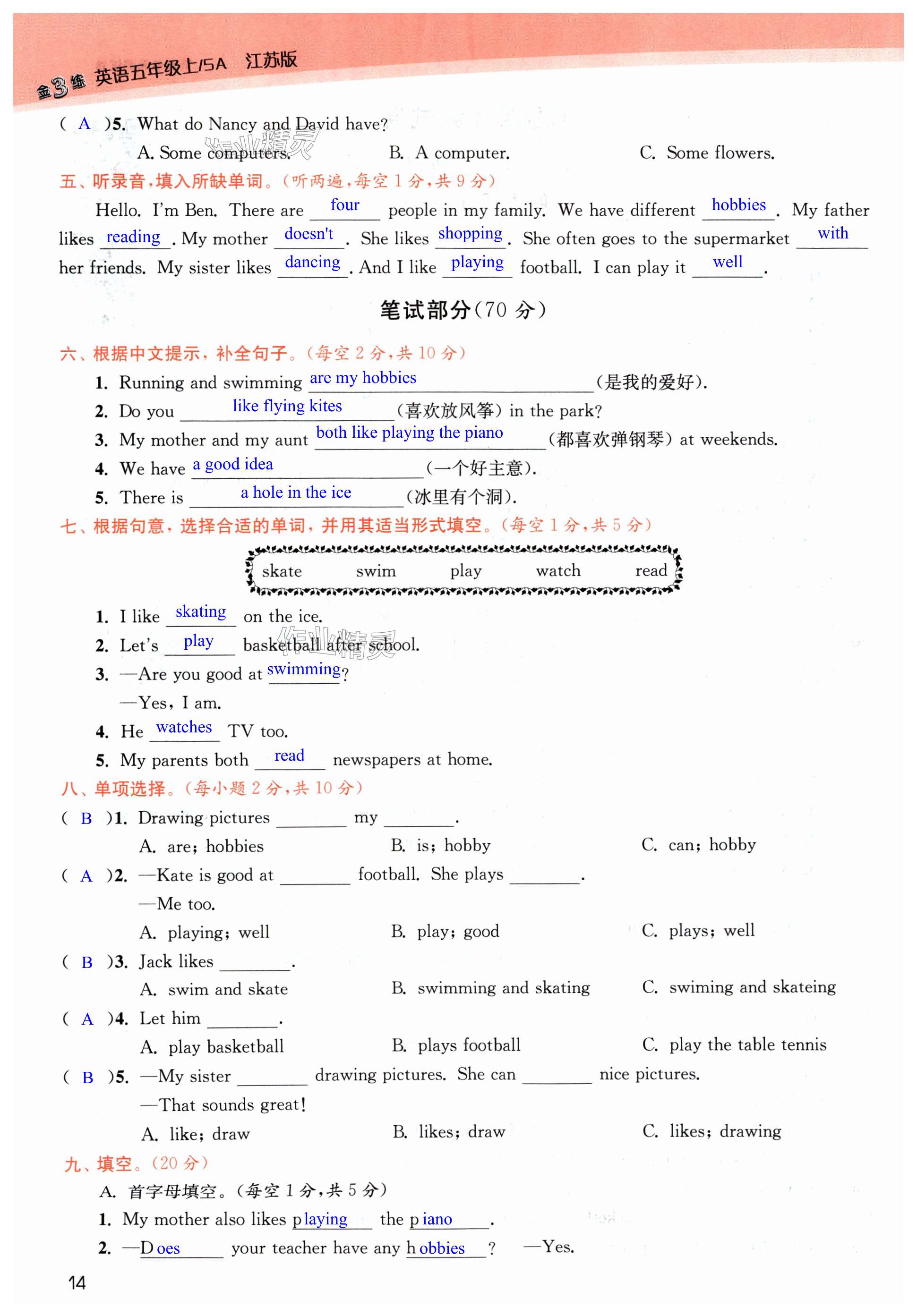 注:目前有些书本章节名称可能整理的还不是很完善,但都是按照顺序排列的,请同学们按照顺序仔细查找。练习册 2024年金3练五年级英语上册译林版 答案主要是用来给同学们做完题方便对答案用的,请勿直接抄袭。