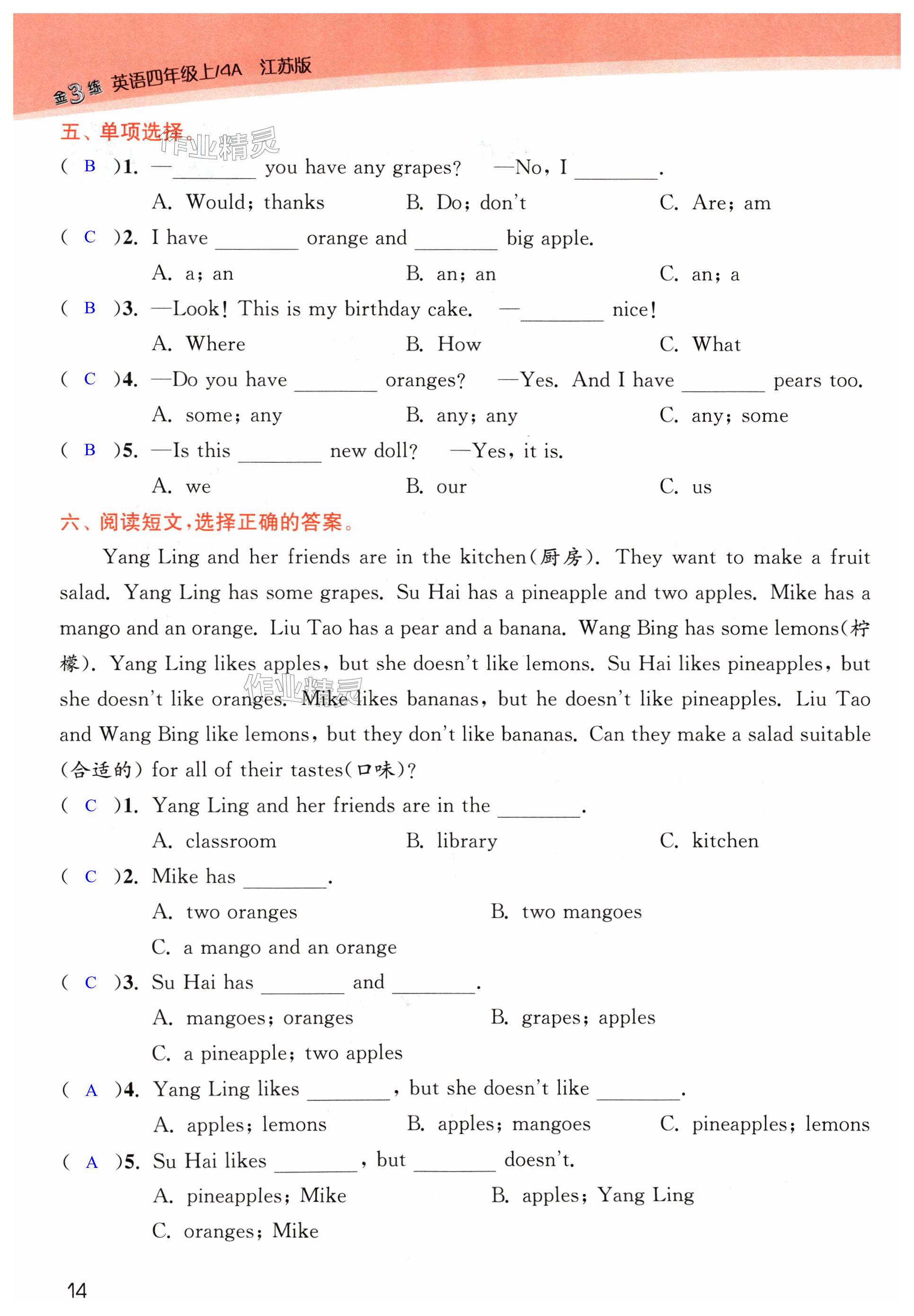 注:目前有些书本章节名称可能整理的还不是很完善,但都是按照顺序排列的,请同学们按照顺序仔细查找。练习册 2024年金3练四年级英语上册译林版 答案主要是用来给同学们做完题方便对答案用的,请勿直接抄袭。