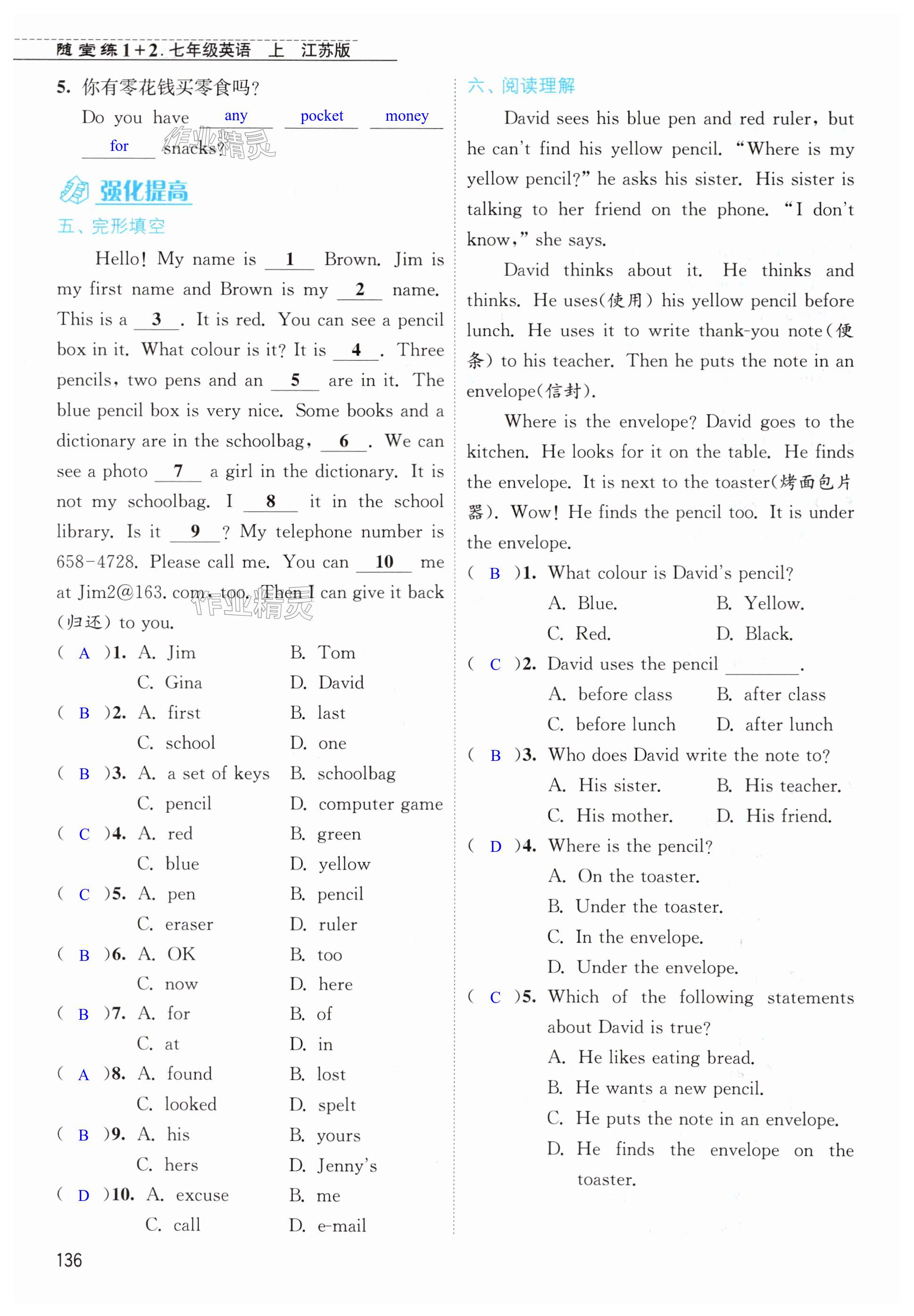 注:目前有些书本章节名称可能整理的还不是很完善,但都是按照顺序排列的,请同学们按照顺序仔细查找。练习册 2024年随堂练1加2七年级英语上册译林版 答案主要是用来给同学们做完题方便对答案用的,请勿直接抄袭。