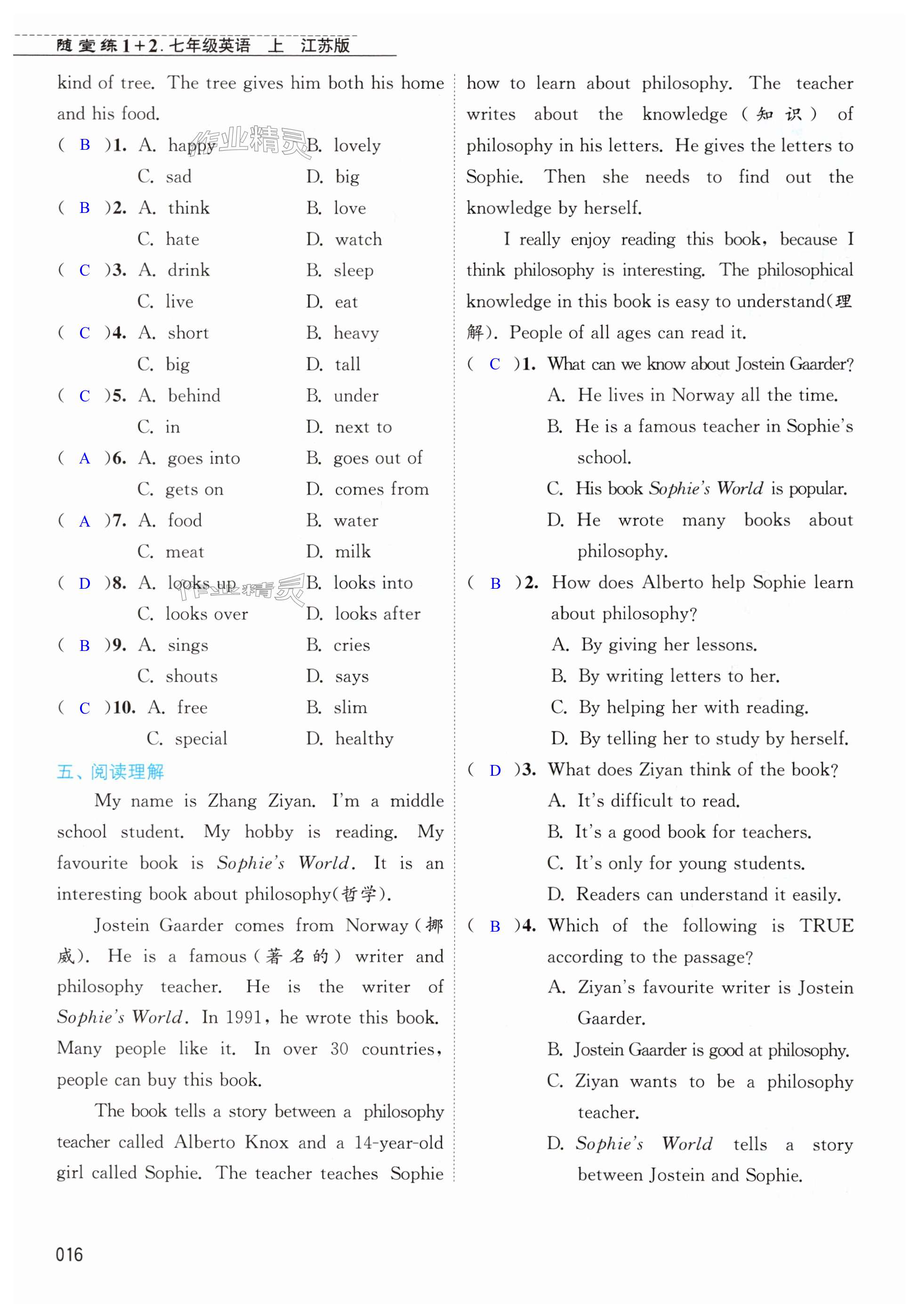 注:目前有些书本章节名称可能整理的还不是很完善,但都是按照顺序排列的,请同学们按照顺序仔细查找。练习册 2024年随堂练1加2七年级英语上册译林版 答案主要是用来给同学们做完题方便对答案用的,请勿直接抄袭。