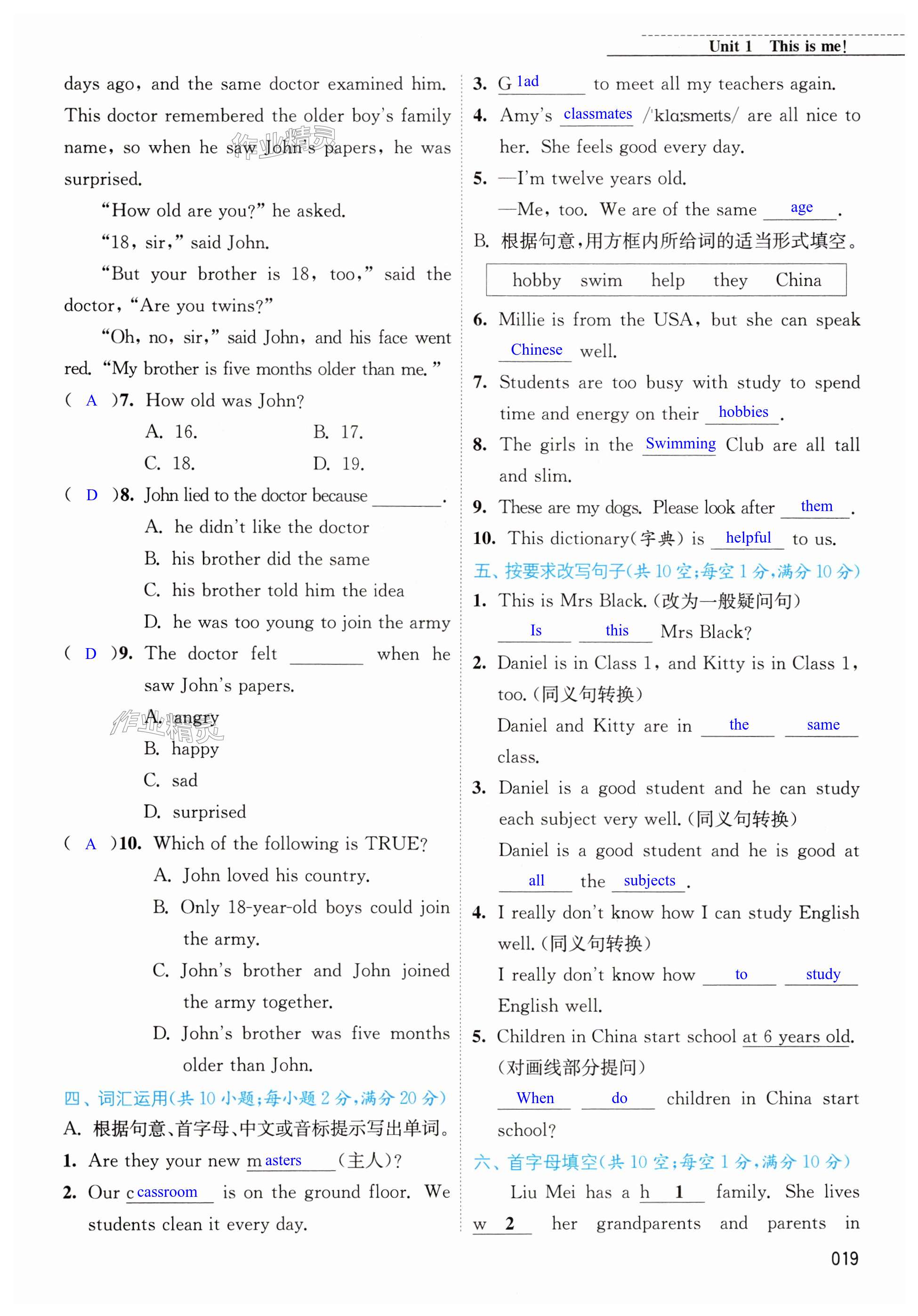 注:目前有些书本章节名称可能整理的还不是很完善,但都是按照顺序排列的,请同学们按照顺序仔细查找。练习册 2024年随堂练1加2七年级英语上册译林版 答案主要是用来给同学们做完题方便对答案用的,请勿直接抄袭。