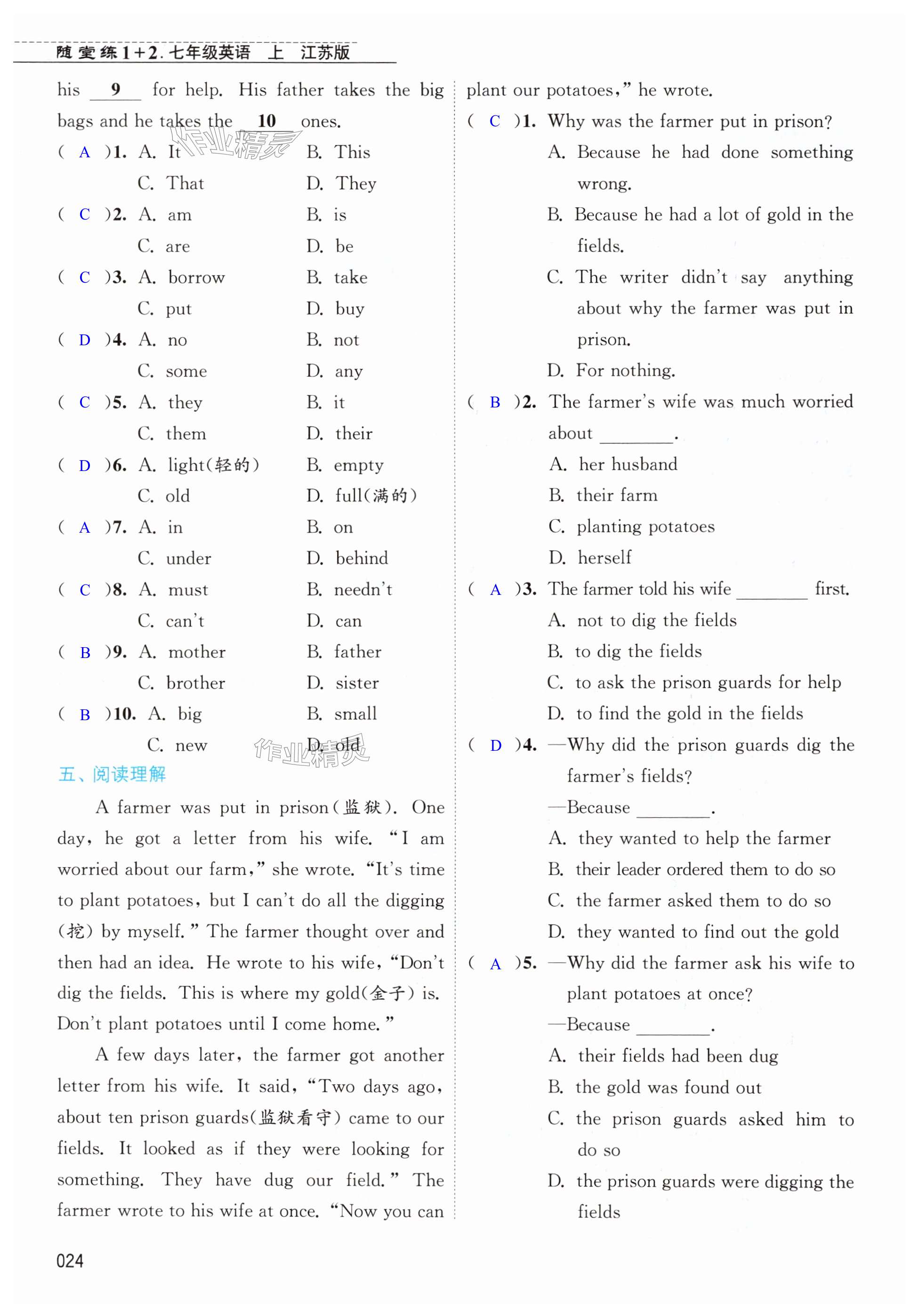 注:目前有些书本章节名称可能整理的还不是很完善,但都是按照顺序排列的,请同学们按照顺序仔细查找。练习册 2024年随堂练1加2七年级英语上册译林版 答案主要是用来给同学们做完题方便对答案用的,请勿直接抄袭。
