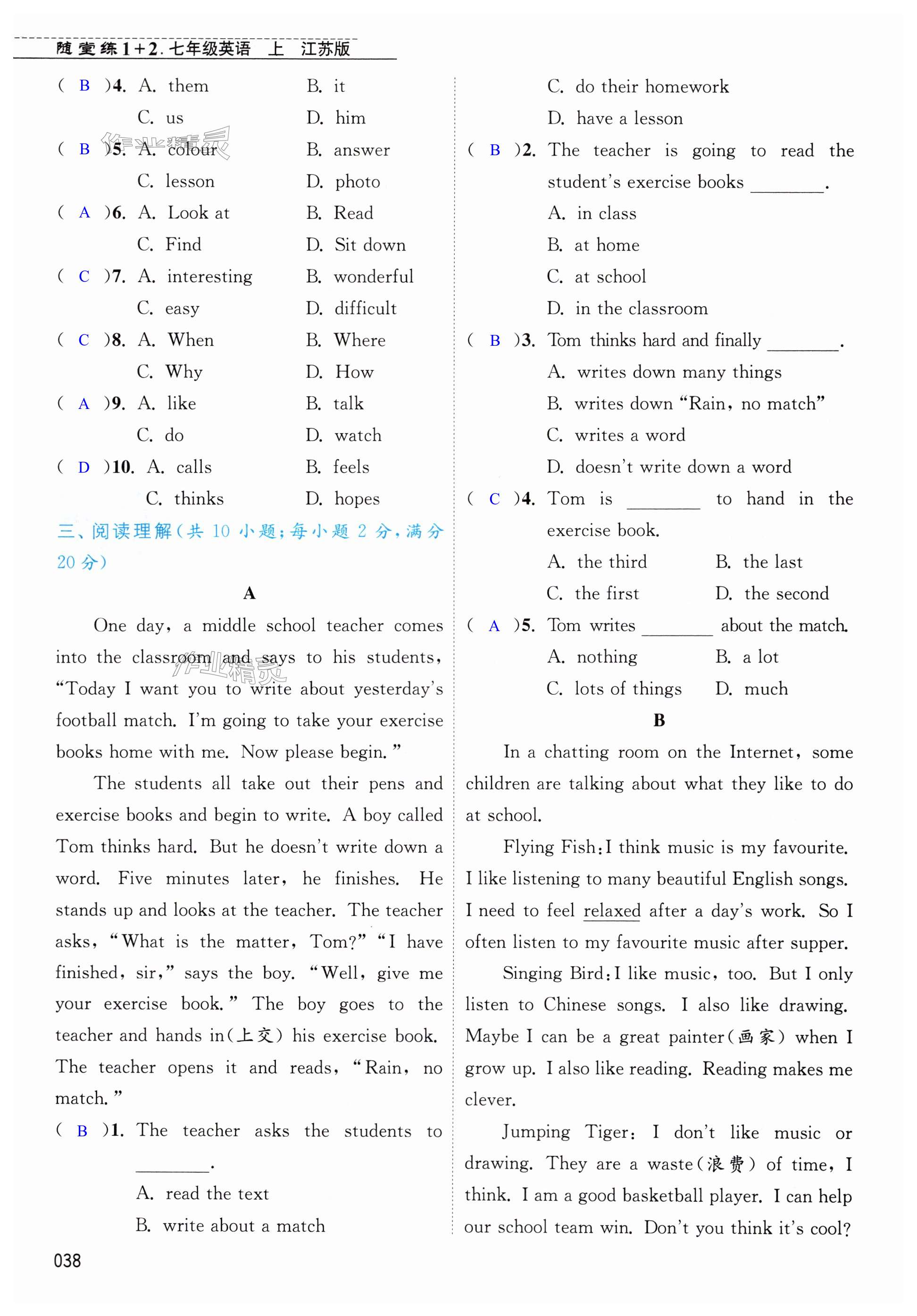 注:目前有些书本章节名称可能整理的还不是很完善,但都是按照顺序排列的,请同学们按照顺序仔细查找。练习册 2024年随堂练1加2七年级英语上册译林版 答案主要是用来给同学们做完题方便对答案用的,请勿直接抄袭。