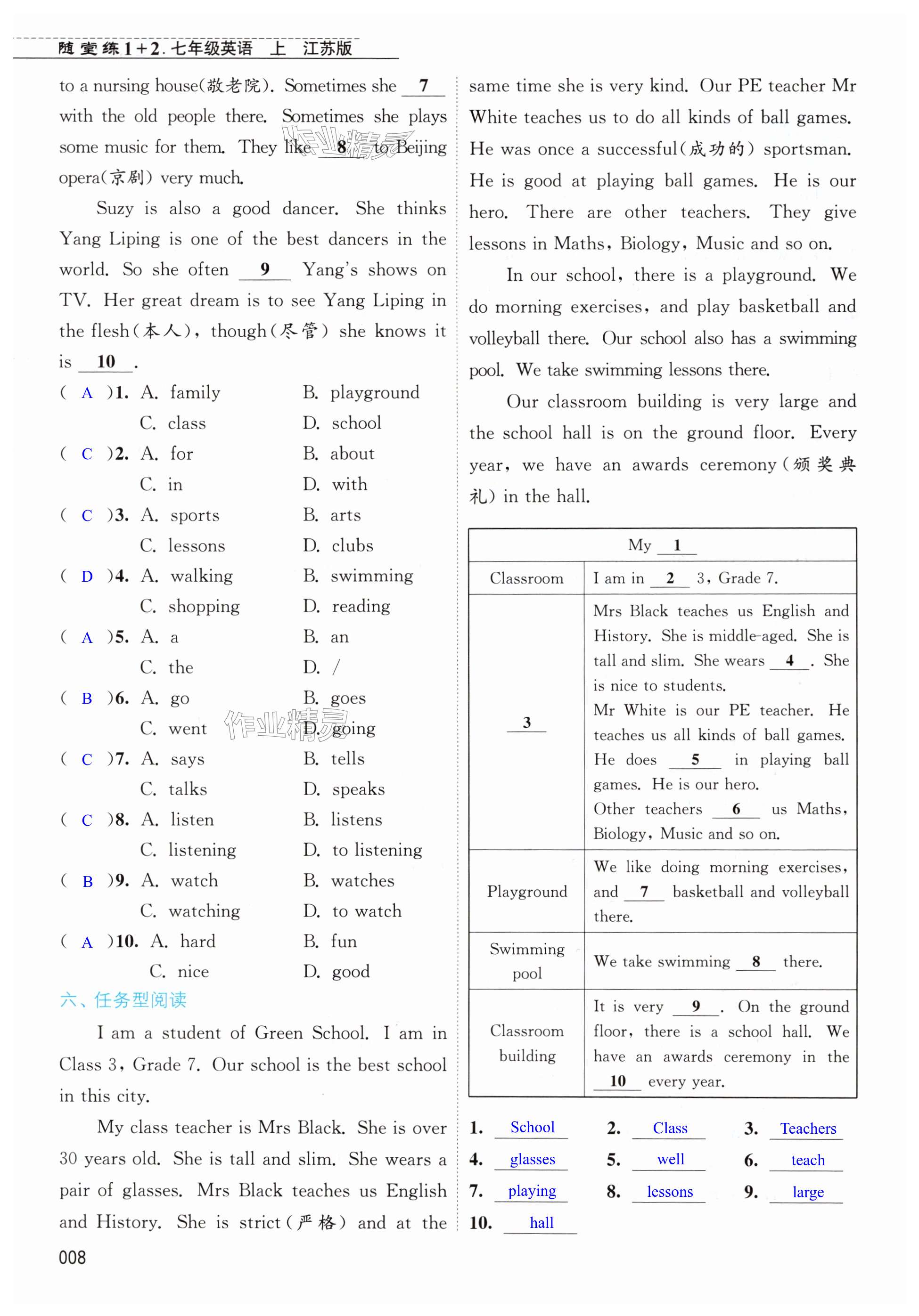 注:目前有些书本章节名称可能整理的还不是很完善,但都是按照顺序排列的,请同学们按照顺序仔细查找。练习册 2024年随堂练1加2七年级英语上册译林版 答案主要是用来给同学们做完题方便对答案用的,请勿直接抄袭。