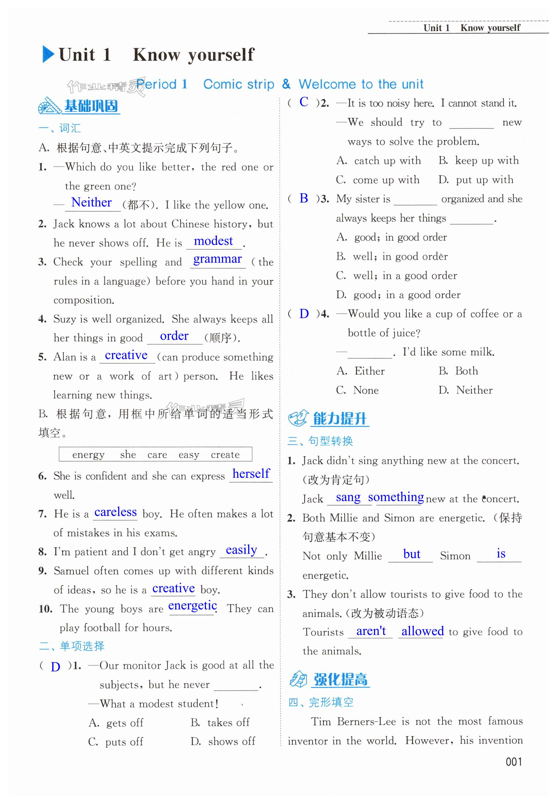 注:目前有些书本章节名称可能整理的还不是很完善,但都是按照顺序排列的,请同学们按照顺序仔细查找。练习册 2023年随堂练1加2九年级英语上册译林版 答案主要是用来给同学们做完题方便对答案用的,请勿直接抄袭。