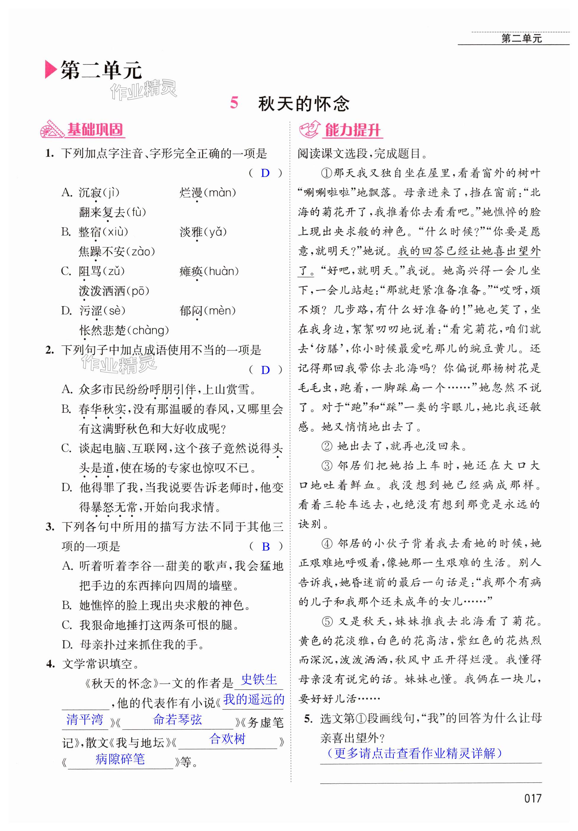 注:目前有些书本章节名称可能整理的还不是很完善,但都是按照顺序排列的,请同学们按照顺序仔细查找。练习册 2024年随堂练1加2七年级语文上册人教版 答案主要是用来给同学们做完题方便对答案用的,请勿直接抄袭。