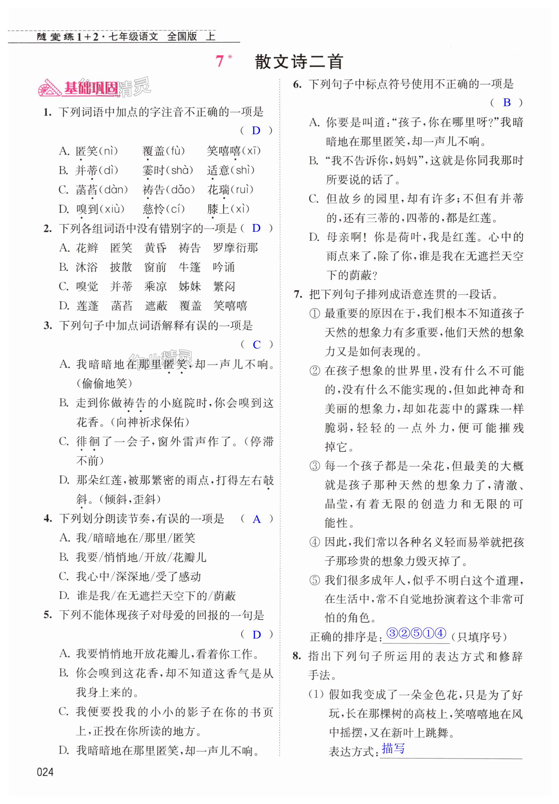 注:目前有些书本章节名称可能整理的还不是很完善,但都是按照顺序排列的,请同学们按照顺序仔细查找。练习册 2024年随堂练1加2七年级语文上册人教版 答案主要是用来给同学们做完题方便对答案用的,请勿直接抄袭。