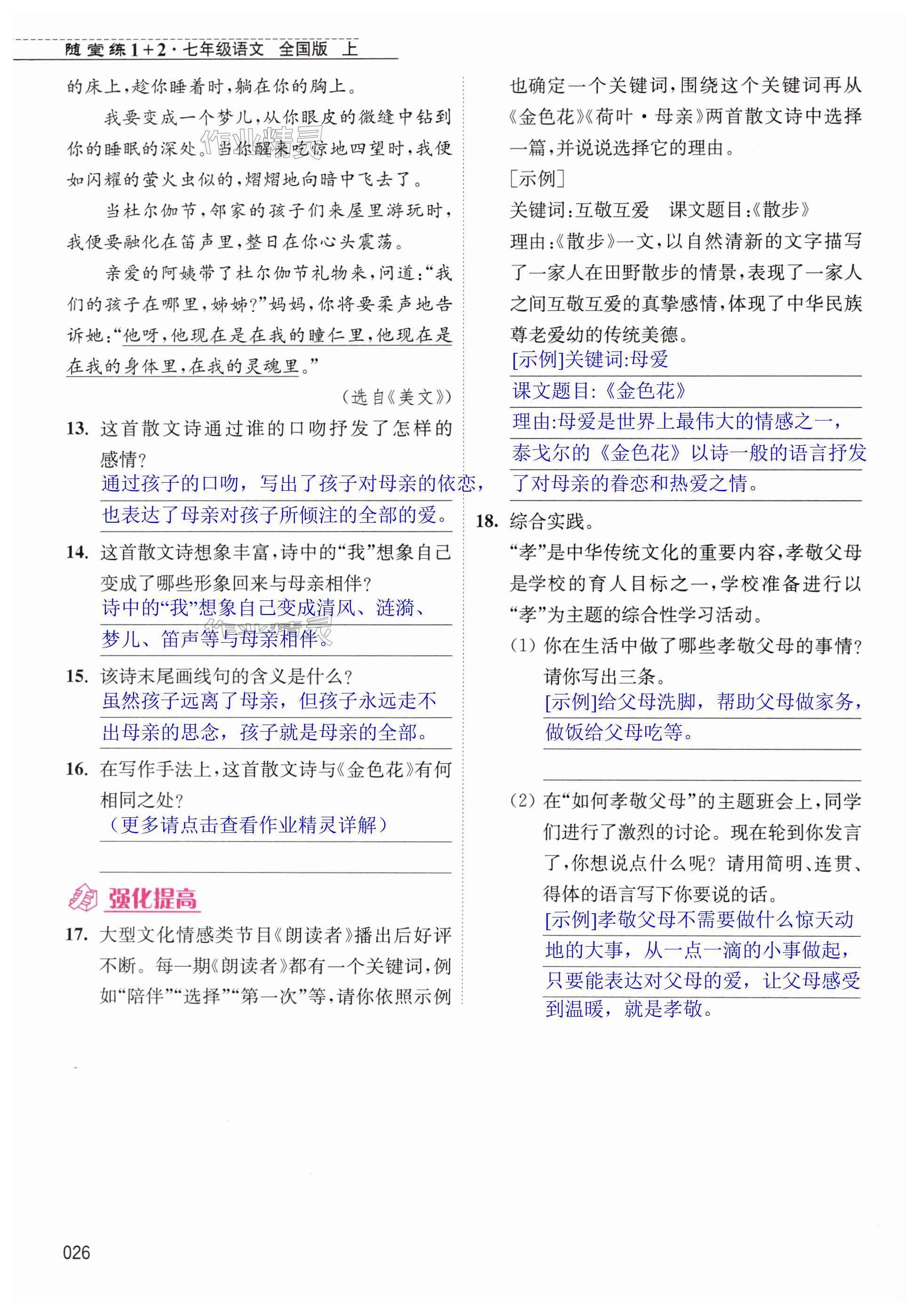 注:目前有些书本章节名称可能整理的还不是很完善,但都是按照顺序排列的,请同学们按照顺序仔细查找。练习册 2024年随堂练1加2七年级语文上册人教版 答案主要是用来给同学们做完题方便对答案用的,请勿直接抄袭。