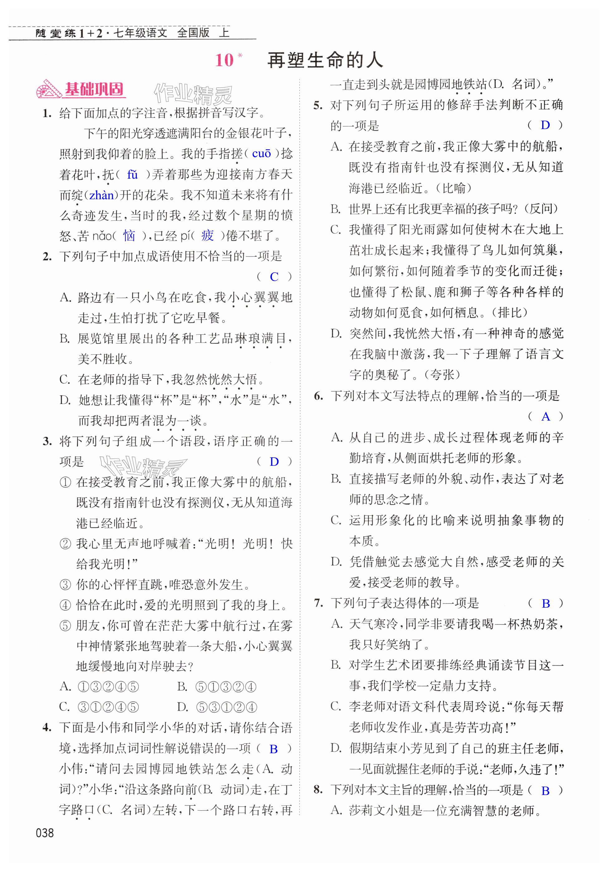 注:目前有些书本章节名称可能整理的还不是很完善,但都是按照顺序排列的,请同学们按照顺序仔细查找。练习册 2024年随堂练1加2七年级语文上册人教版 答案主要是用来给同学们做完题方便对答案用的,请勿直接抄袭。
