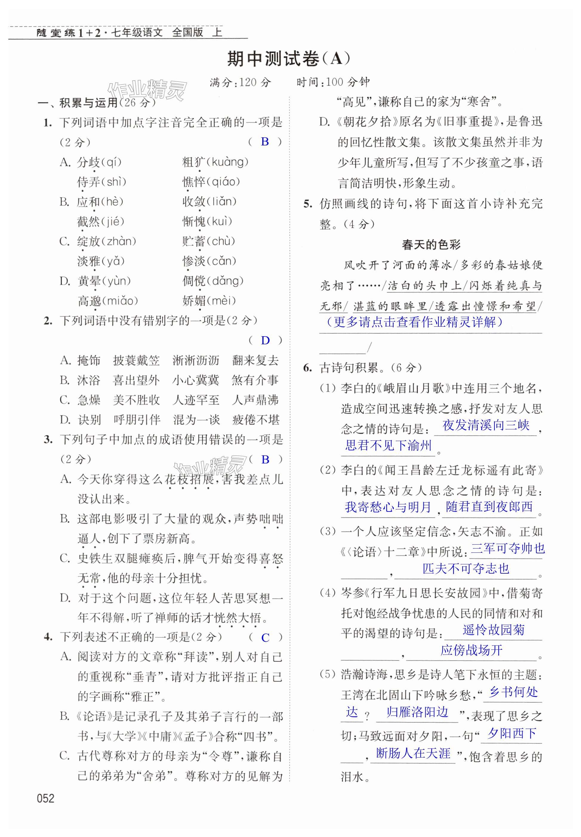 注:目前有些书本章节名称可能整理的还不是很完善,但都是按照顺序排列的,请同学们按照顺序仔细查找。练习册 2024年随堂练1加2七年级语文上册人教版 答案主要是用来给同学们做完题方便对答案用的,请勿直接抄袭。