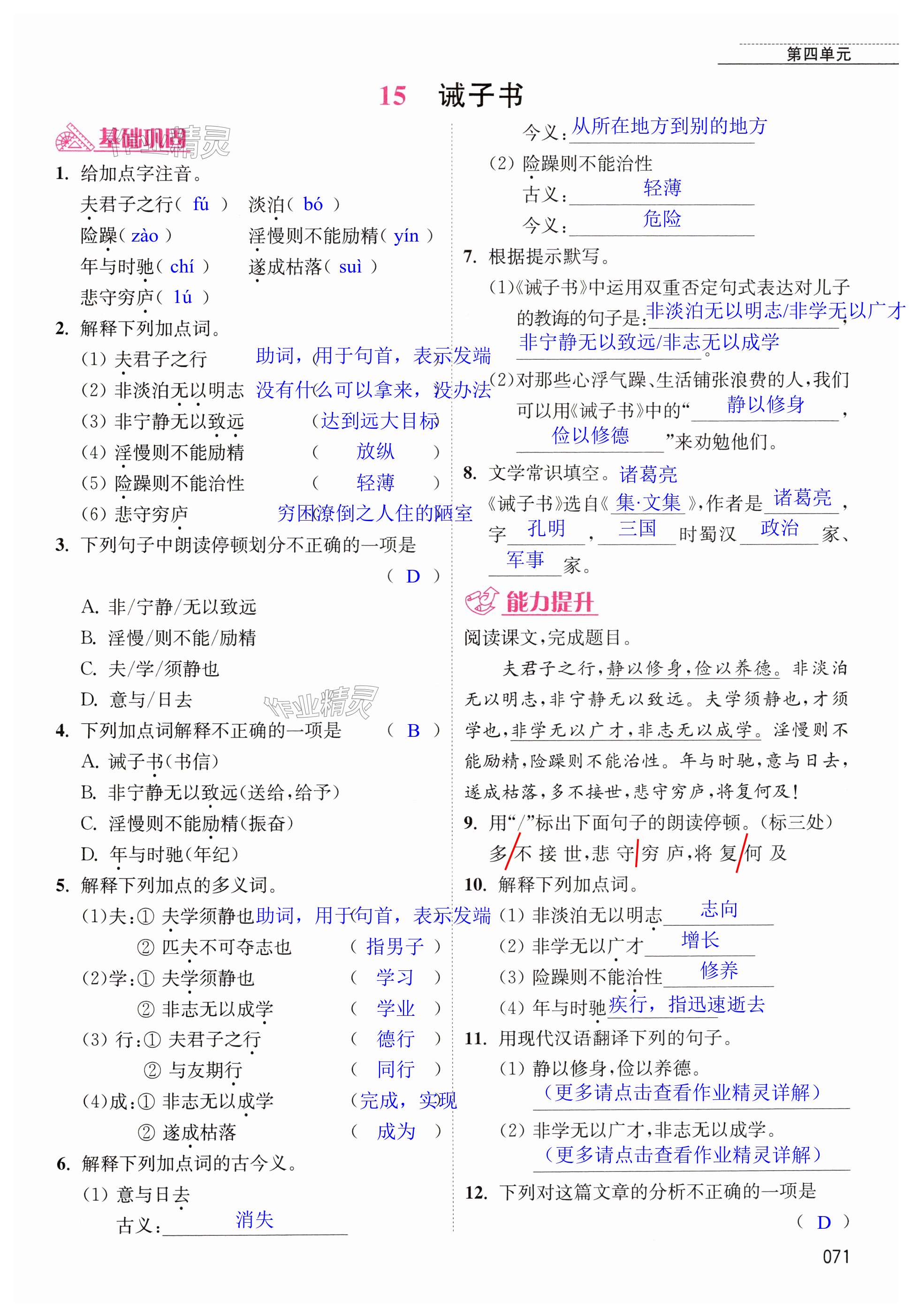 注:目前有些书本章节名称可能整理的还不是很完善,但都是按照顺序排列的,请同学们按照顺序仔细查找。练习册 2024年随堂练1加2七年级语文上册人教版 答案主要是用来给同学们做完题方便对答案用的,请勿直接抄袭。