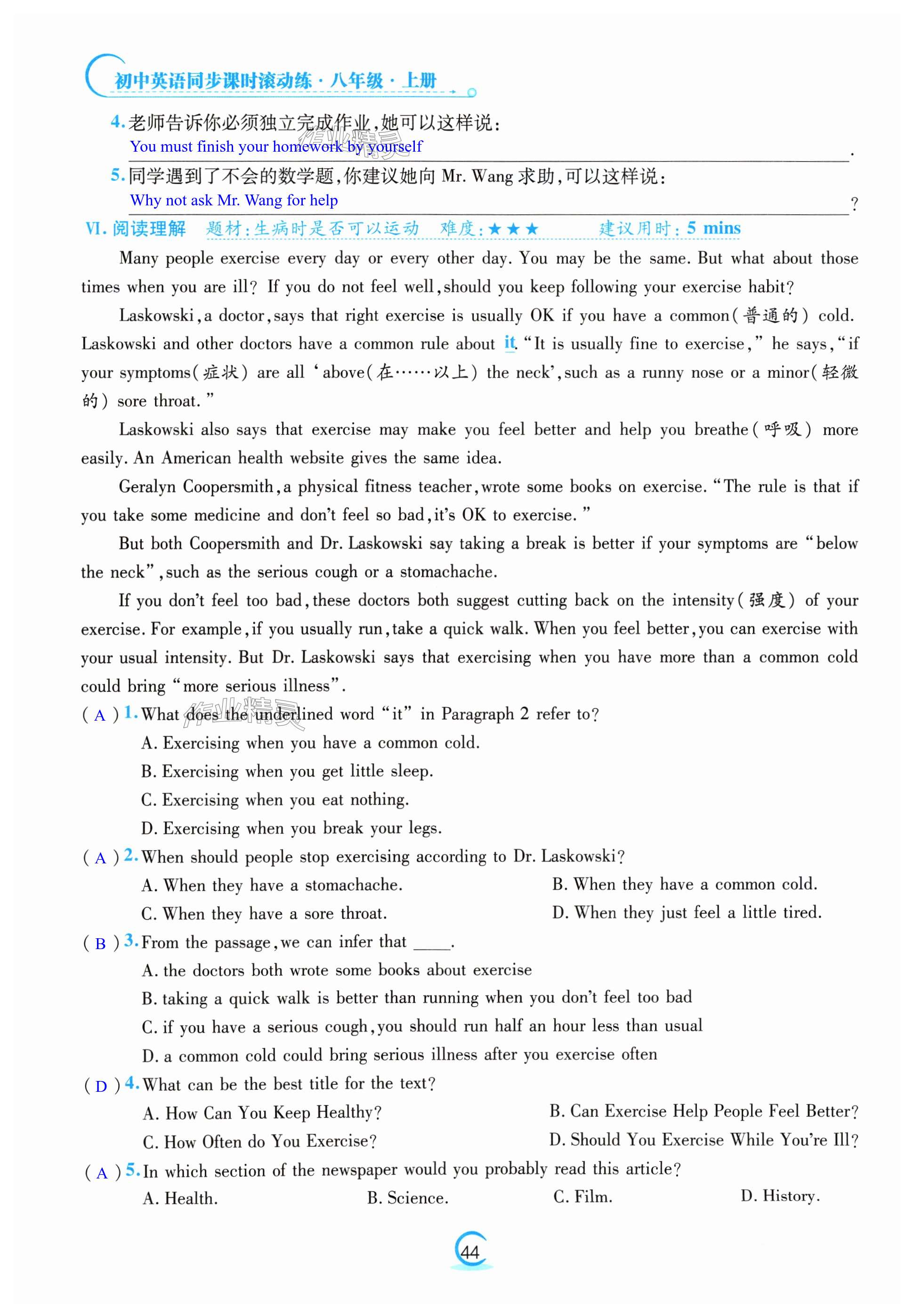 注:目前有些书本章节名称可能整理的还不是很完善,但都是按照顺序排列的,请同学们按照顺序仔细查找。练习册 2024年激情英语初中同步课时滚动练八年级上册仁爱版 答案主要是用来给同学们做完题方便对答案用的,请勿直接抄袭。
