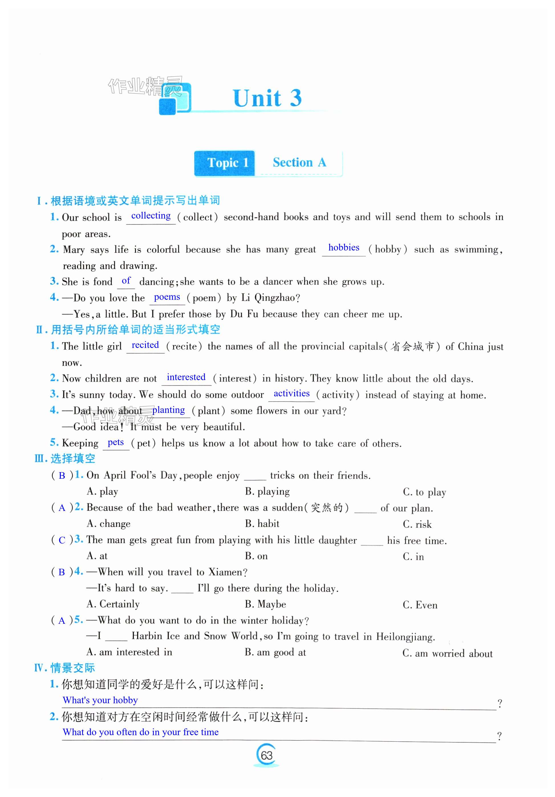 注:目前有些书本章节名称可能整理的还不是很完善,但都是按照顺序排列的,请同学们按照顺序仔细查找。练习册 2024年激情英语初中同步课时滚动练八年级上册仁爱版 答案主要是用来给同学们做完题方便对答案用的,请勿直接抄袭。