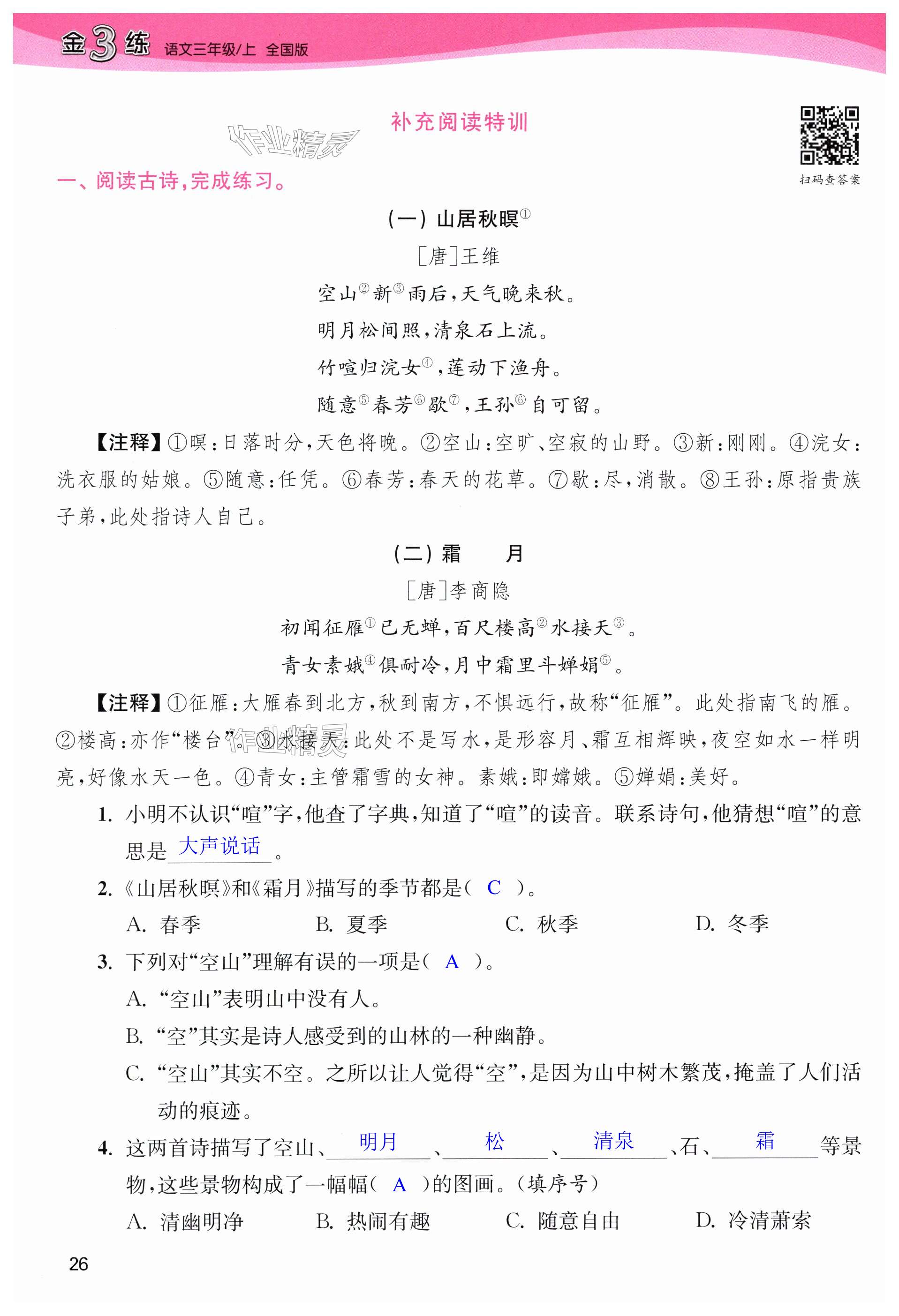 注:目前有些书本章节名称可能整理的还不是很完善,但都是按照顺序排列的,请同学们按照顺序仔细查找。练习册 2024年新编金3练三年级语文上册人教版 答案主要是用来给同学们做完题方便对答案用的,请勿直接抄袭。