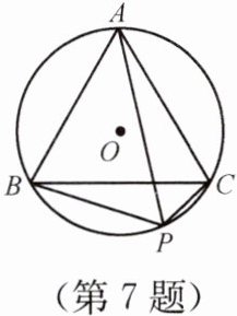7. 如图,$\triangle ABC是\odot O$的内接等边三角形,P是$\overset{\frown}{BC}$上一点.探索PA与PB+PC之间的数量关系,并说明理由.