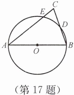 17. 如图,$AB是\odot O$的直径,点$C在\odot O$外,$AC交\odot O于点E$,$BC交\odot O于点D$,且$CD = BD$,$\angle C = 70^\circ$.给出下列结论:① $\angle A = 40^\circ$;② $AC = AB$;③ $\widehat{AE} = \widehat{BE}$.其中,正确结论的序号是( ).