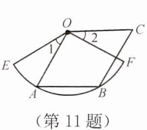 11. 如图,四边形OABC是菱形,点A、B在扇形OEF的$\overset{\frown}{EF}$上,OA= 3,∠1= ∠2,则扇形OEF的面积为( ).