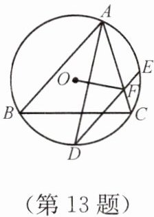 13. 如图,⊙O是△ABC的外接圆,AD平分∠BAC,交⊙O于点D,弦DE//BA,交AC于点F. OF与AD有怎样的位置关系和数量关系?为什么?