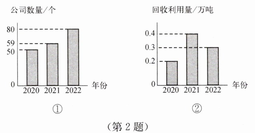 2. 小丽通过对某地区2020~2022年再生资源回收利用公司发展情况的调查,制成了该地区再生资源回收利用公司数量情况的条形统计图(图①),以及再生资源回收利用公司再生资源年回收利用量的平均数的条形统计图(图②).利用图①、图②提供的信息,解答下列问题: