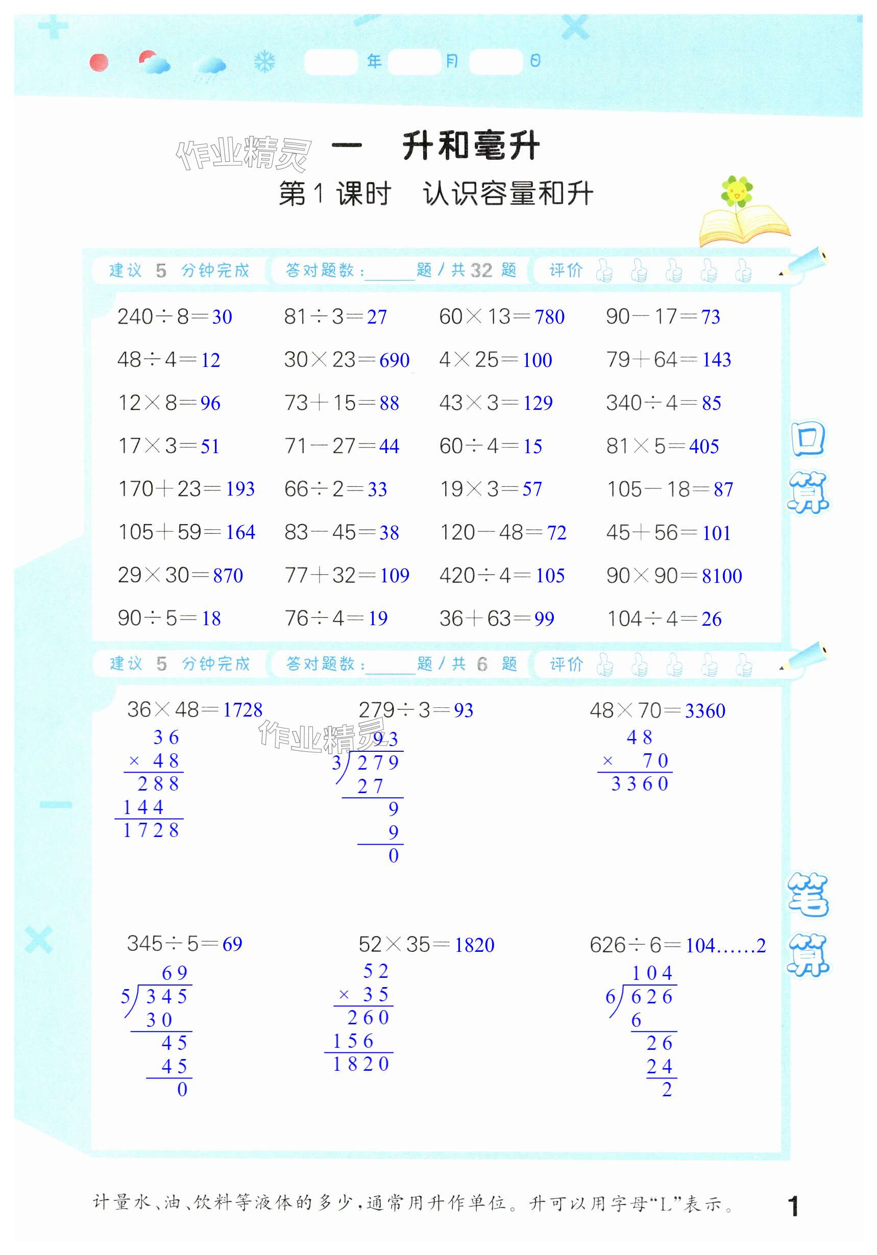 注:目前有些书本章节名称可能整理的还不是很完善,但都是按照顺序排列的,请同学们按照顺序仔细查找。练习册 2024年口算大通关四年级数学上册苏教版 答案主要是用来给同学们做完题方便对答案用的,请勿直接抄袭。