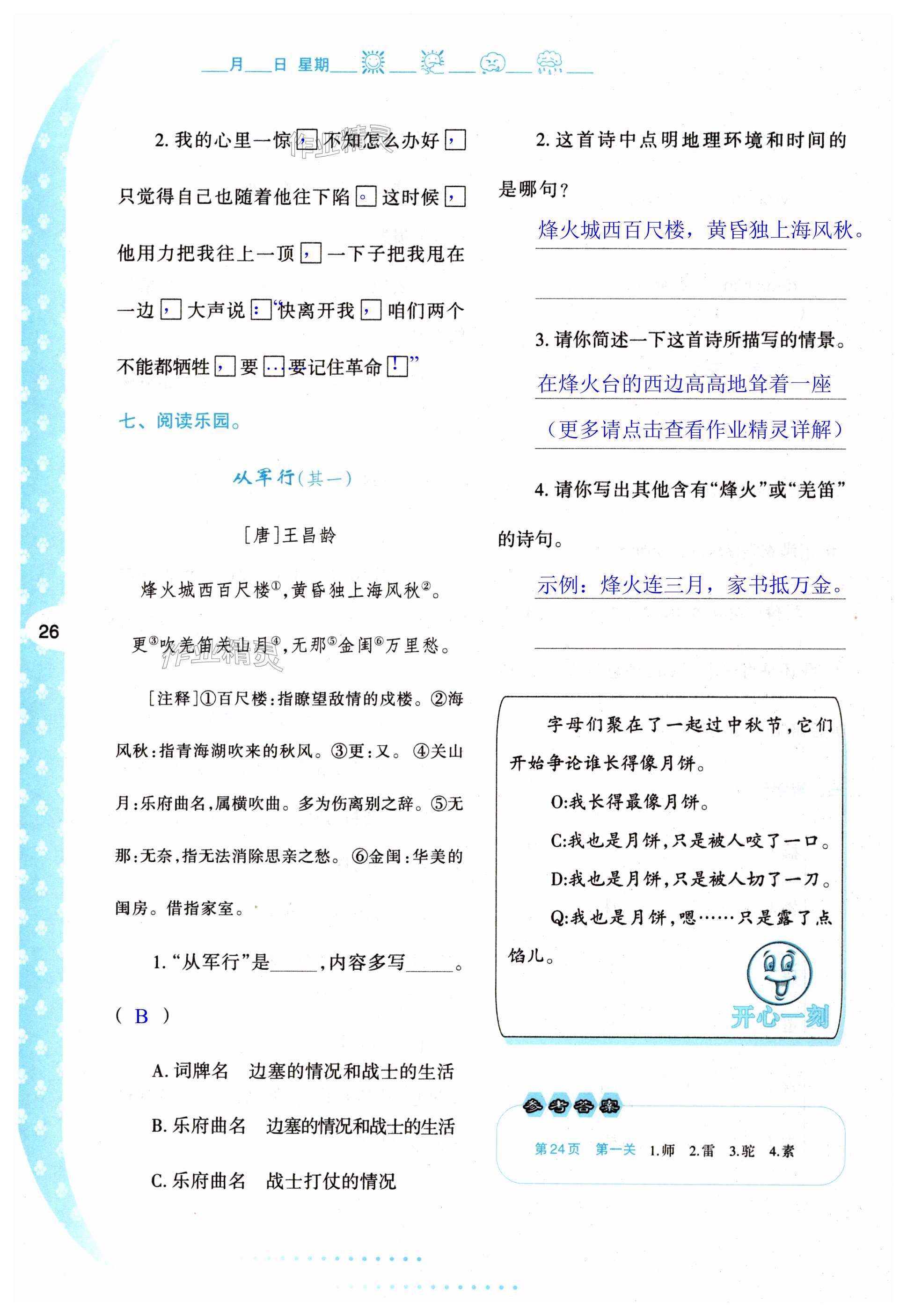 注:目前有些书本章节名称可能整理的还不是很完善,但都是按照顺序排列的,请同学们按照顺序仔细查找。练习册 2024年暑假作业与生活陕西人民教育出版社五年级语文人教版 答案主要是用来给同学们做完题方便对答案用的,请勿直接抄袭。