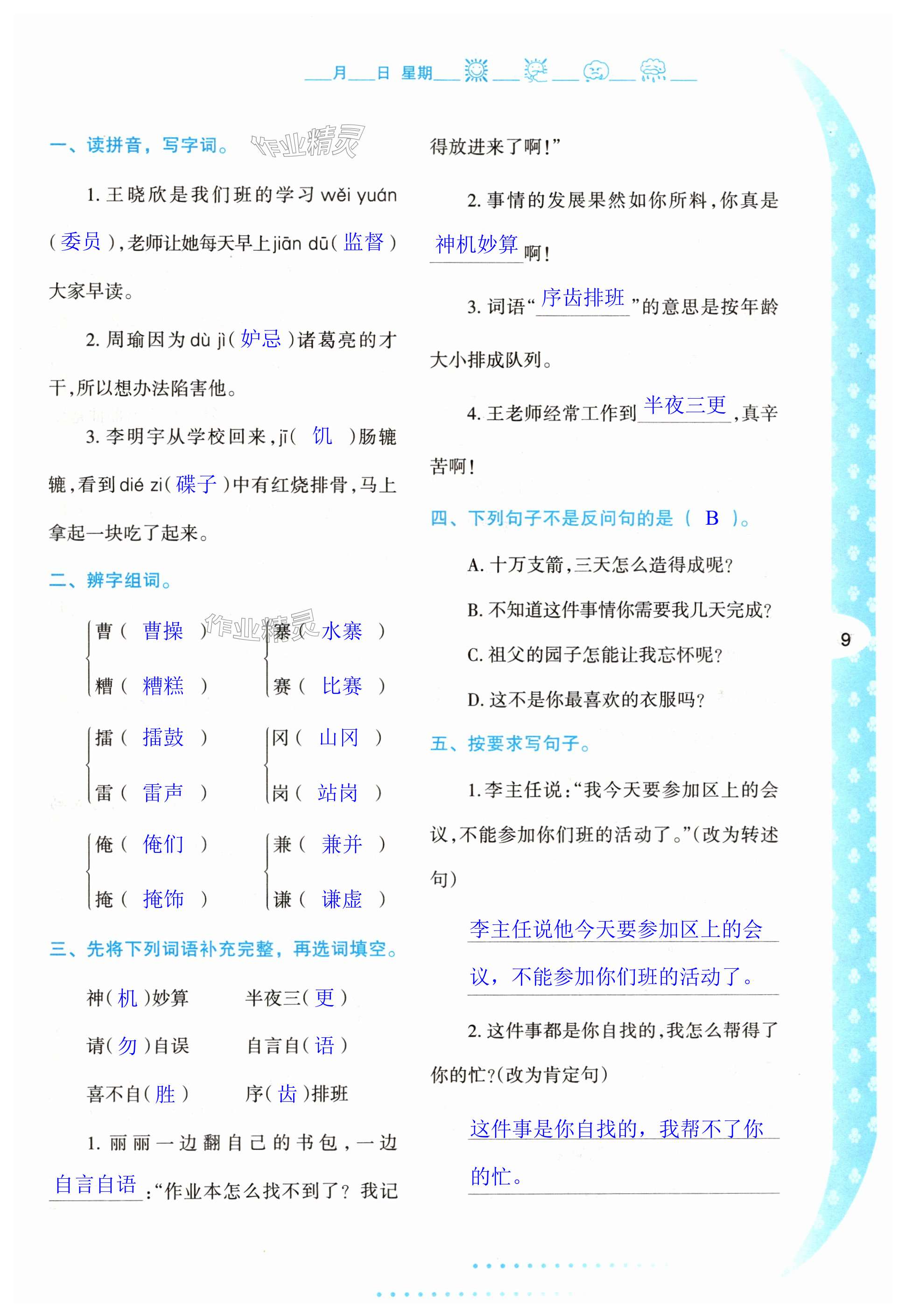 注:目前有些书本章节名称可能整理的还不是很完善,但都是按照顺序排列的,请同学们按照顺序仔细查找。练习册 2024年暑假作业与生活陕西人民教育出版社五年级语文人教版 答案主要是用来给同学们做完题方便对答案用的,请勿直接抄袭。