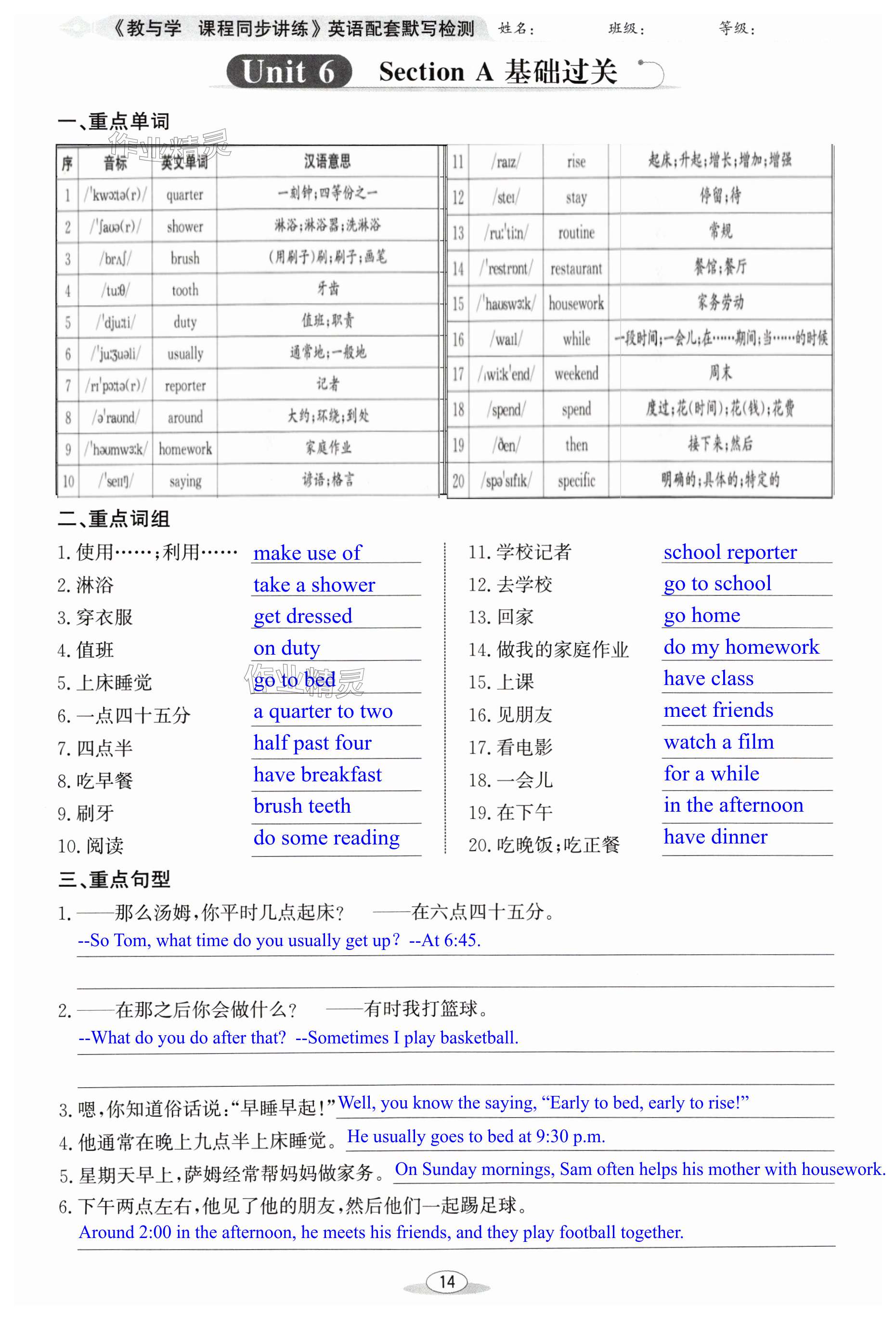 注:目前有些书本章节名称可能整理的还不是很完善,但都是按照顺序排列的,请同学们按照顺序仔细查找。练习册 2024年教与学课程同步讲练七年级英语上册人教版 答案主要是用来给同学们做完题方便对答案用的,请勿直接抄袭。