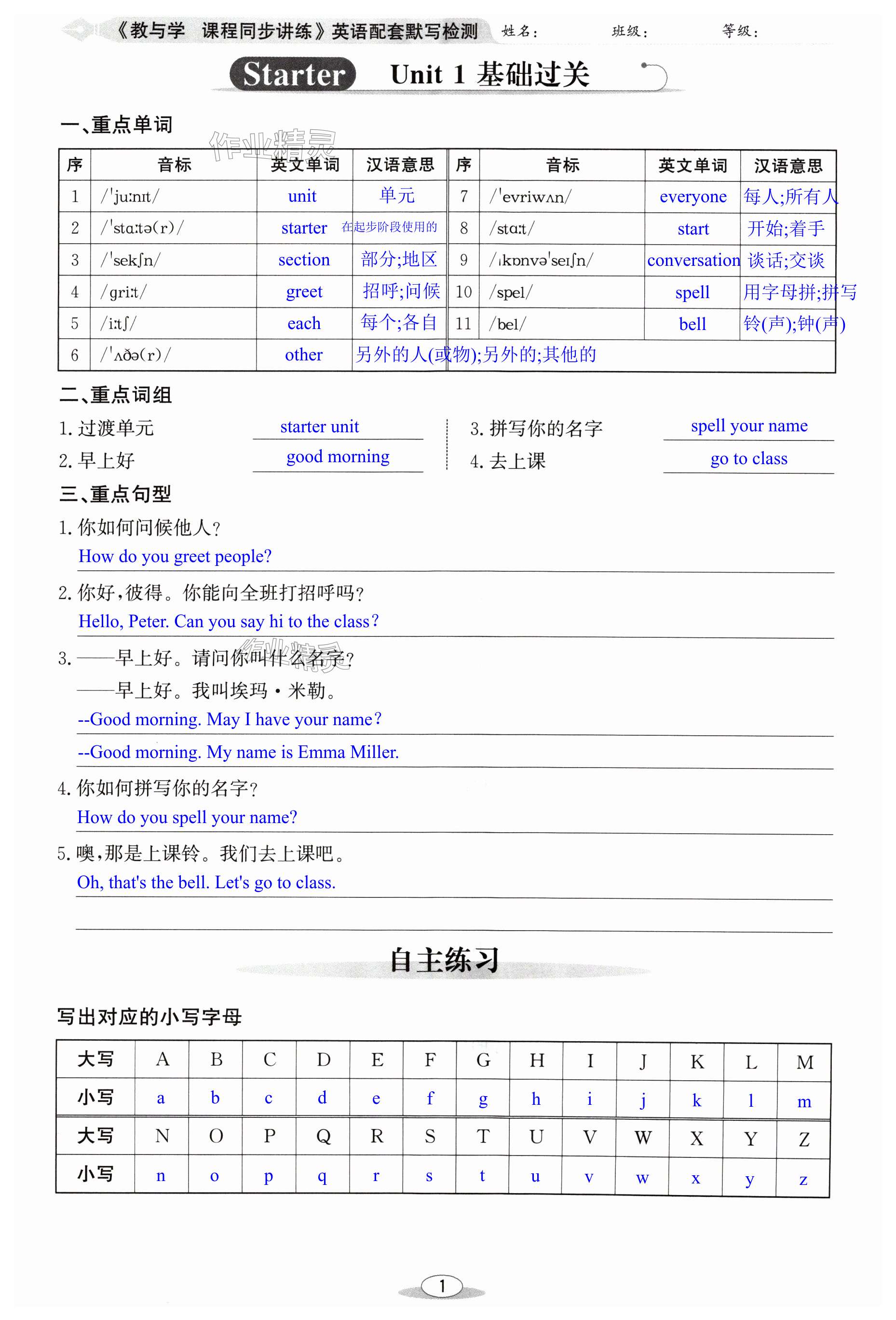 注:目前有些书本章节名称可能整理的还不是很完善,但都是按照顺序排列的,请同学们按照顺序仔细查找。练习册 2024年教与学课程同步讲练七年级英语上册人教版 答案主要是用来给同学们做完题方便对答案用的,请勿直接抄袭。