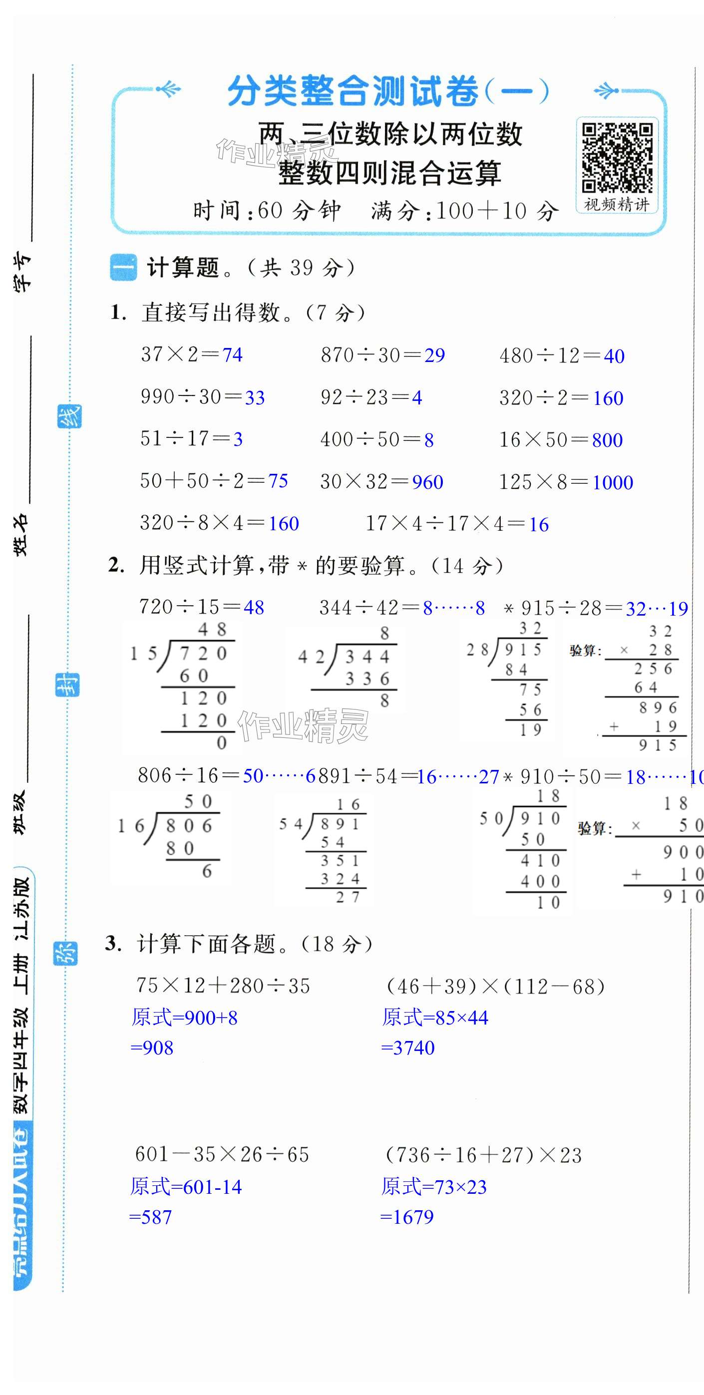 注:目前有些书本章节名称可能整理的还不是很完善,但都是按照顺序排列的,请同学们按照顺序仔细查找。练习册 2024年亮点给力大试卷四年级数学上册苏教版 答案主要是用来给同学们做完题方便对答案用的,请勿直接抄袭。