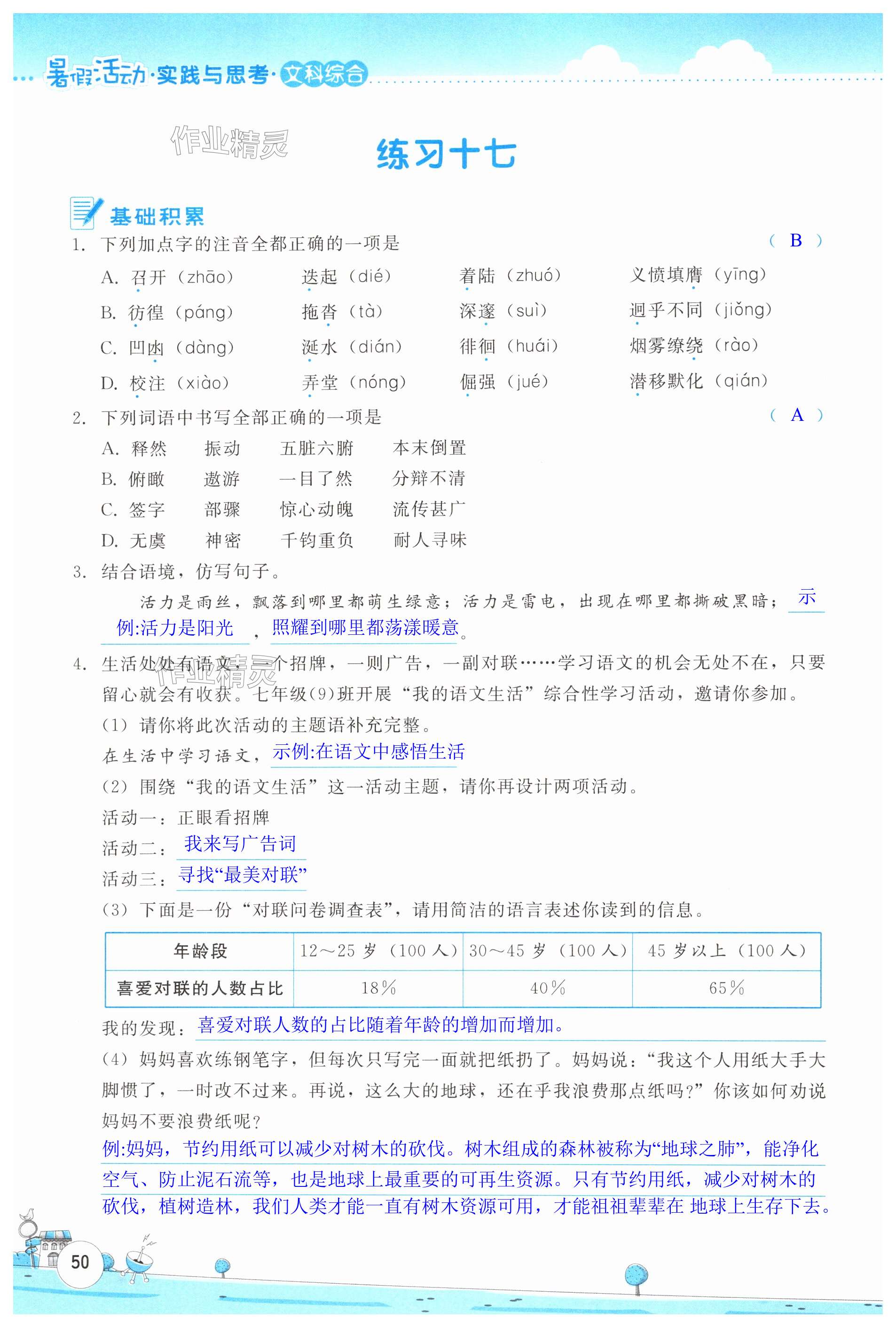 注:目前有些书本章节名称可能整理的还不是很完善,但都是按照顺序排列的,请同学们按照顺序仔细查找。练习册 2024年暑假活动实践与思考七年级文综人教版 答案主要是用来给同学们做完题方便对答案用的,请勿直接抄袭。