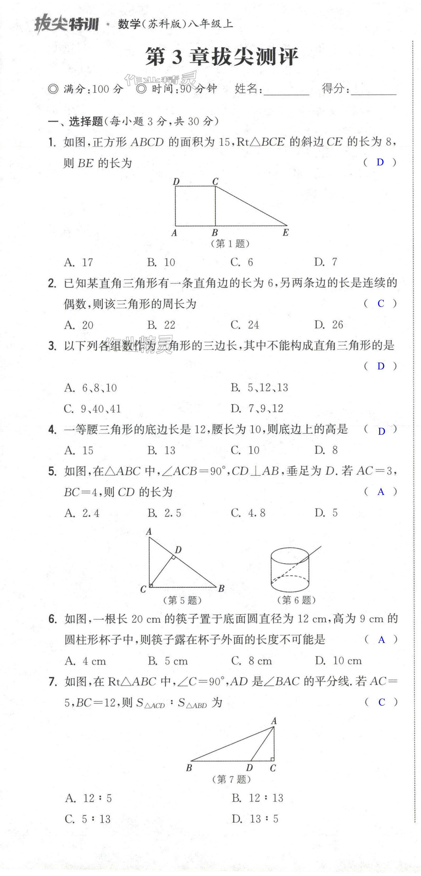 注:目前有些书本章节名称可能整理的还不是很完善,但都是按照顺序排列的,请同学们按照顺序仔细查找。练习册 2024年拔尖特训八年级数学上册苏科版 答案主要是用来给同学们做完题方便对答案用的,请勿直接抄袭。