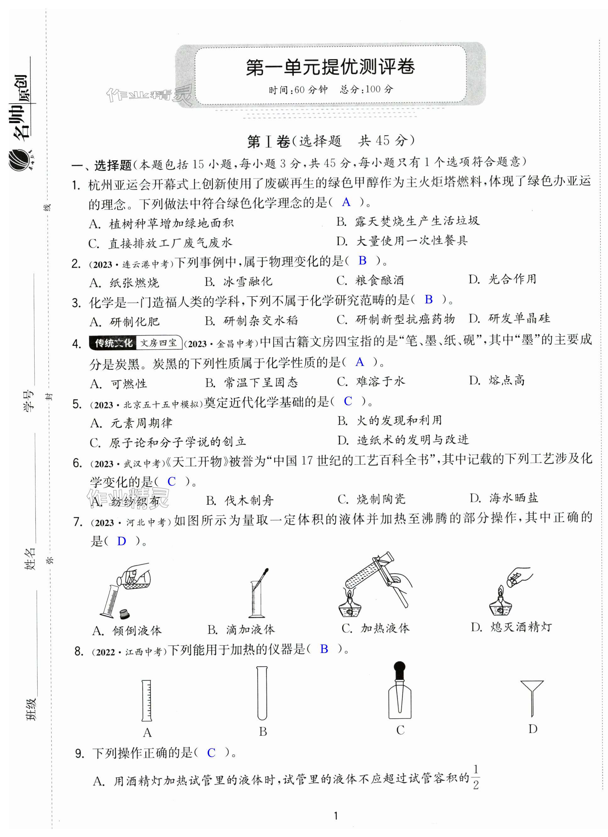 注:目前有些书本章节名称可能整理的还不是很完善,但都是按照顺序排列的,请同学们按照顺序仔细查找。练习册 2024年实验班提优训练九年级化学上册人教版 答案主要是用来给同学们做完题方便对答案用的,请勿直接抄袭。