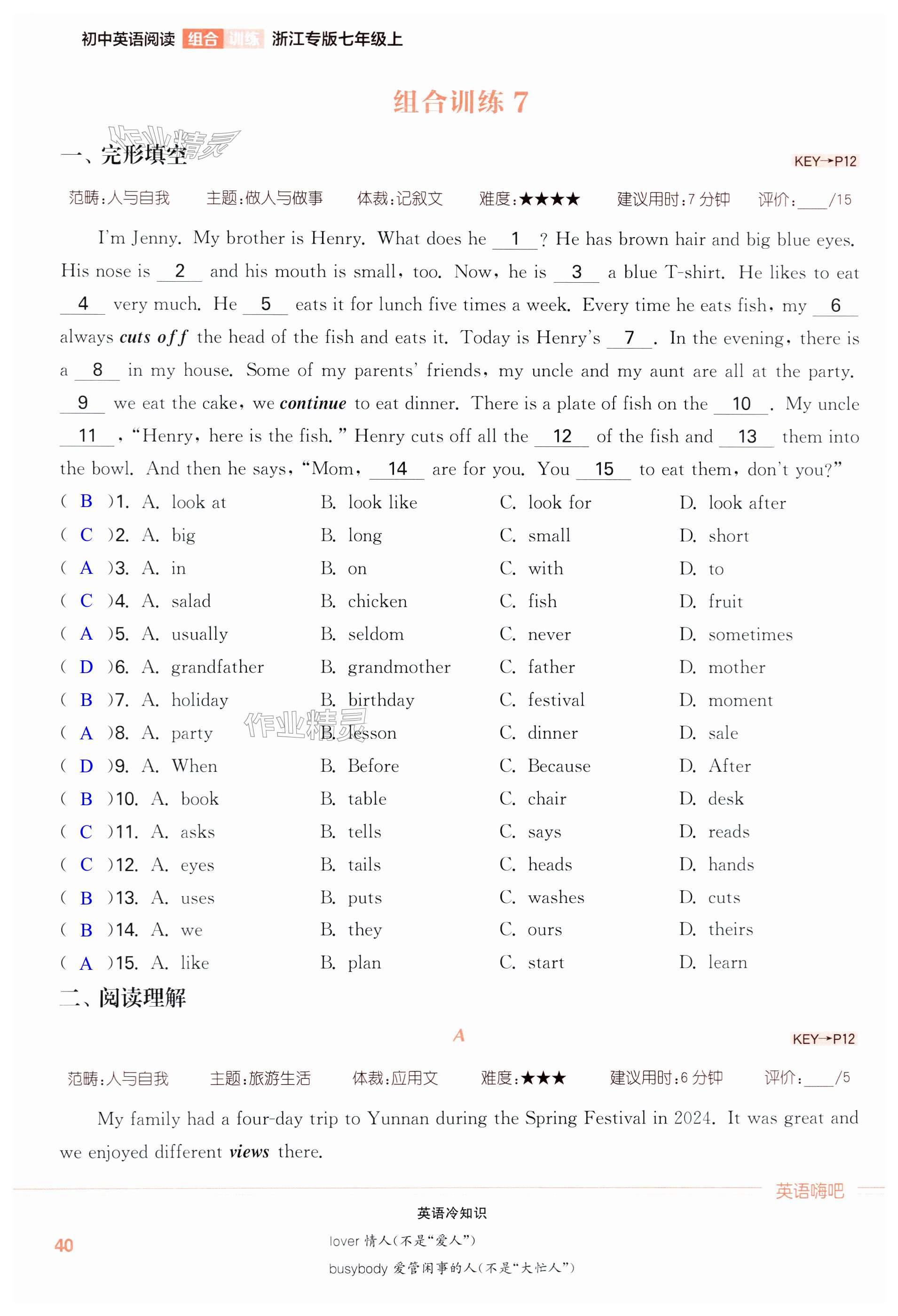 注:目前有些书本章节名称可能整理的还不是很完善,但都是按照顺序排列的,请同学们按照顺序仔细查找。练习册 2024年通城学典初中英语阅读组合训练七年级上册浙江专版 答案主要是用来给同学们做完题方便对答案用的,请勿直接抄袭。