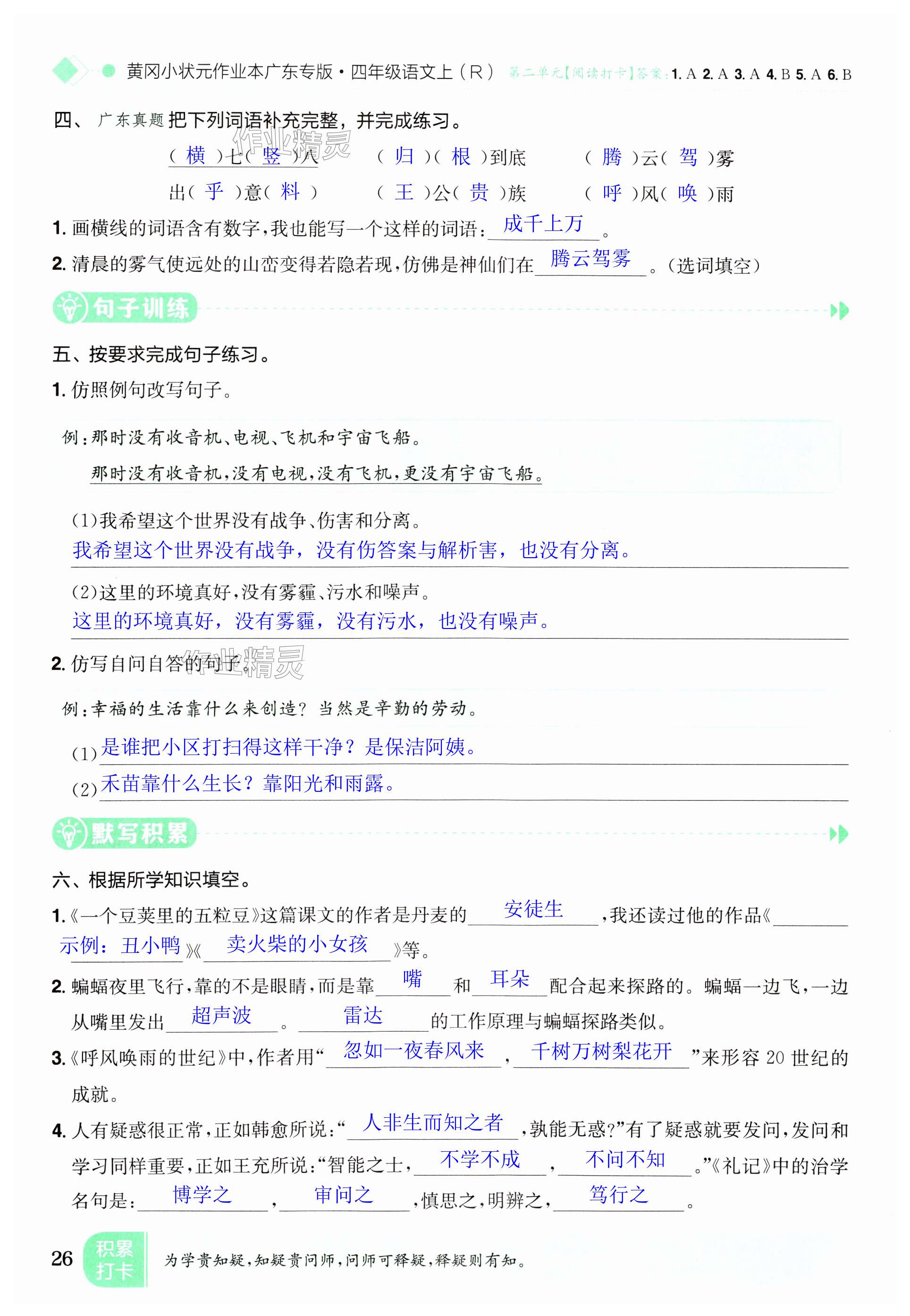 注:目前有些书本章节名称可能整理的还不是很完善,但都是按照顺序排列的,请同学们按照顺序仔细查找。练习册 2024年黄冈小状元作业本四年级语文上册人教版广东专版 答案主要是用来给同学们做完题方便对答案用的,请勿直接抄袭。