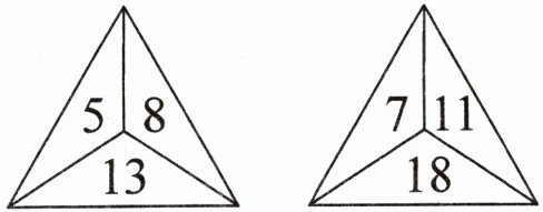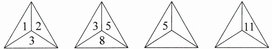 点拨:横着看,三角形内的左上角的数分别是1、3、5,后一个数都比前一个数多2;右上角的数分别是2、5、( )、11,后一个数都比前一个数多3;最下面的数都是同一个三角形内上面两个数的和,1+2= 3,3+5= 8。