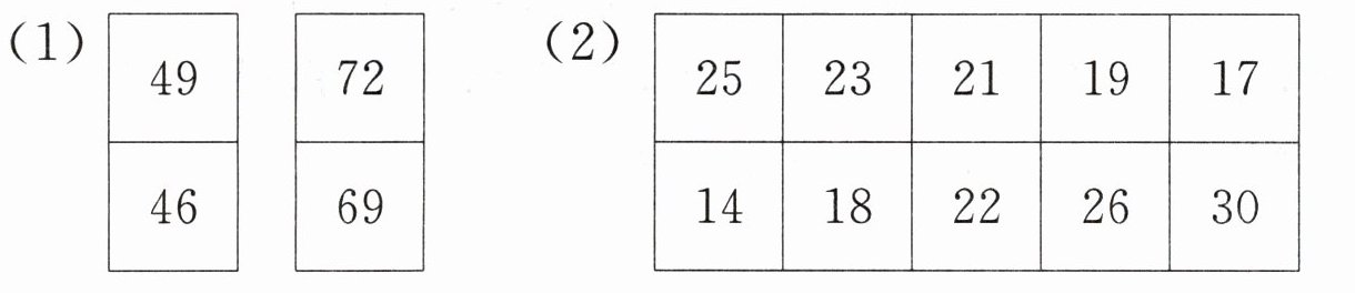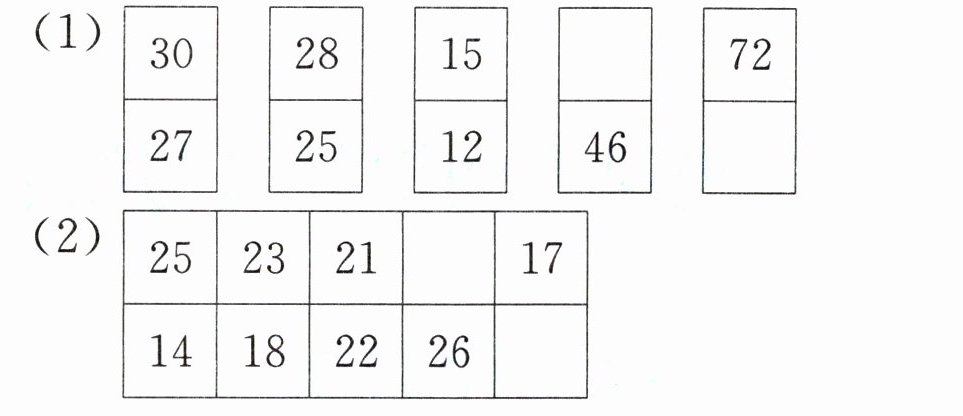 (2)我们把每一组数分成上下两部分,上面部分的数是25、23、21,后一个数比前一个数少2,21-2= 19,接下来填19;下面部分是14、18、22、26,后一个数比前一个数多4。26+4= 30,接下来填30。