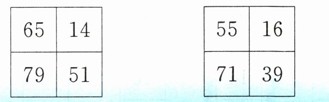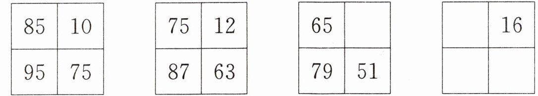 点拨:每个正方形内,左上角的数是85、75、65、( ),规律是后一个数都比前一个数少10;右上角的数是10、12、( )、16,规律是后一个数都比前一个数多2;左下角的数都是上面两个数的和;右下角的数都是上面两个数的差。