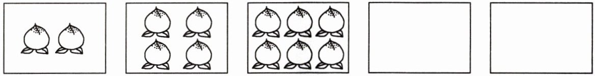 点拨:仔细观察桃的个数,可以发现,每幅图中桃的个数是在有规律地变化着,分别是2个、4个、6个……$ $后一幅图中桃的个数比前一幅图中桃的个数多2个,所以接下去应该画8个桃和10个桃。