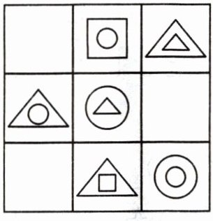 点拨:仔细观察,可以发现每个图形都是由大小两个图形组成,而且大小图形都有正方形、三角形或圆。我们可以试着把大小图形分开来考虑。对于大图形来说,每行每列都没有重复,小图形也是一样,每行每列也都只有一个小正方形、一个小圆和一个小三角形。根据这个规律,可以画出空白处的图形。