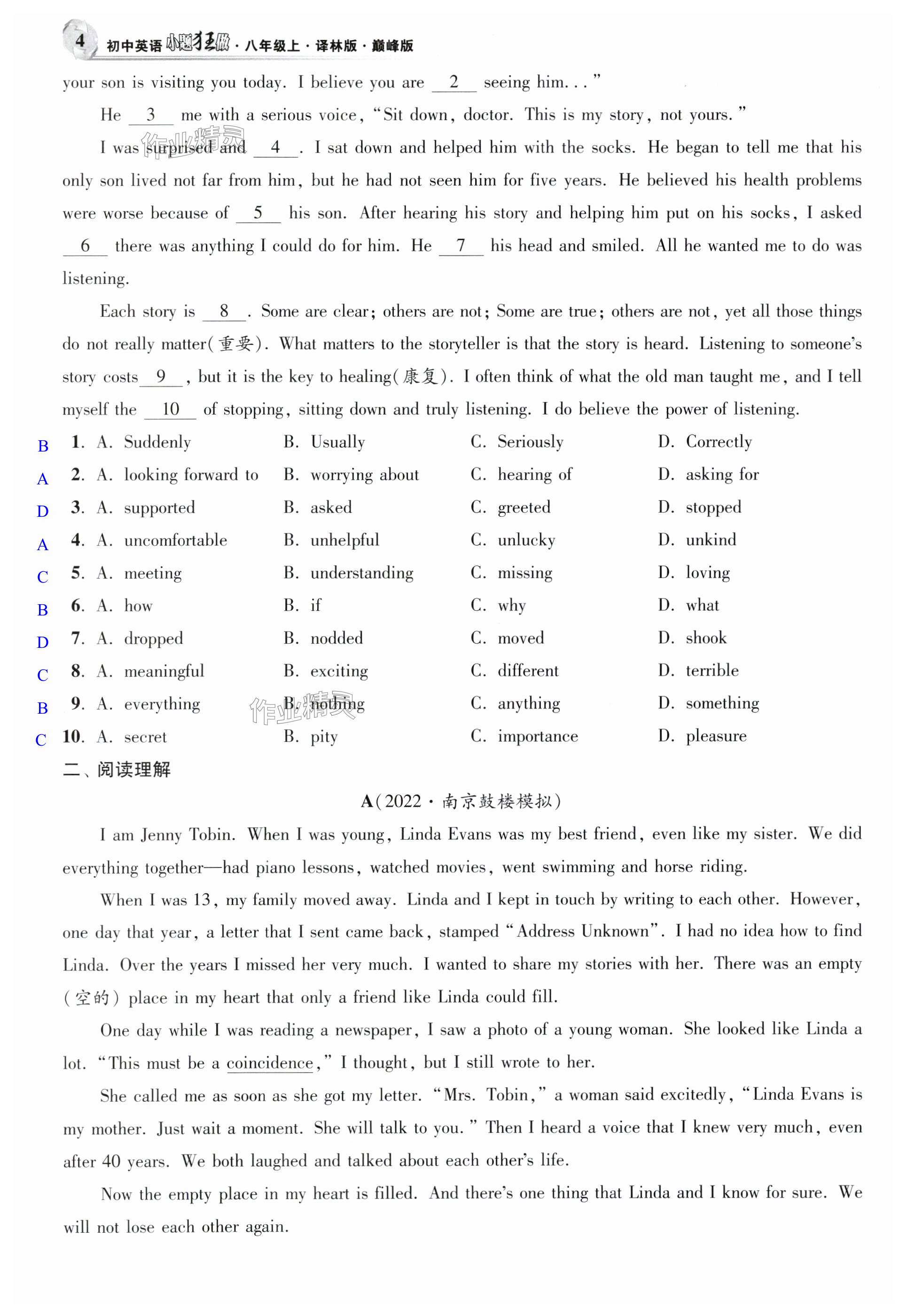 注:目前有些书本章节名称可能整理的还不是很完善,但都是按照顺序排列的,请同学们按照顺序仔细查找。练习册 2024年小题狂做八年级英语上册译林版巅峰版 答案主要是用来给同学们做完题方便对答案用的,请勿直接抄袭。
