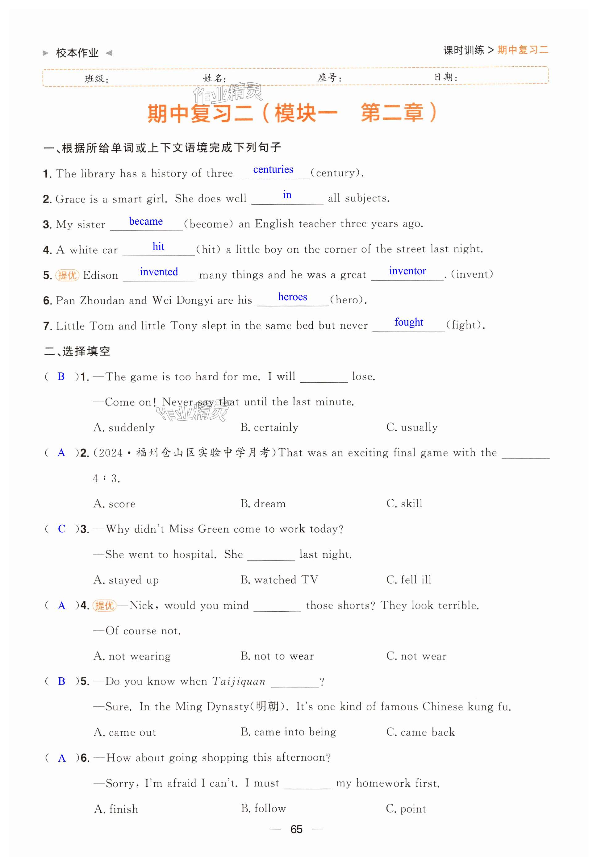 注:目前有些书本章节名称可能整理的还不是很完善,但都是按照顺序排列的,请同学们按照顺序仔细查找。练习册 2024年阳光同学分层设计八年级英语上册人教版福建专版 答案主要是用来给同学们做完题方便对答案用的,请勿直接抄袭。