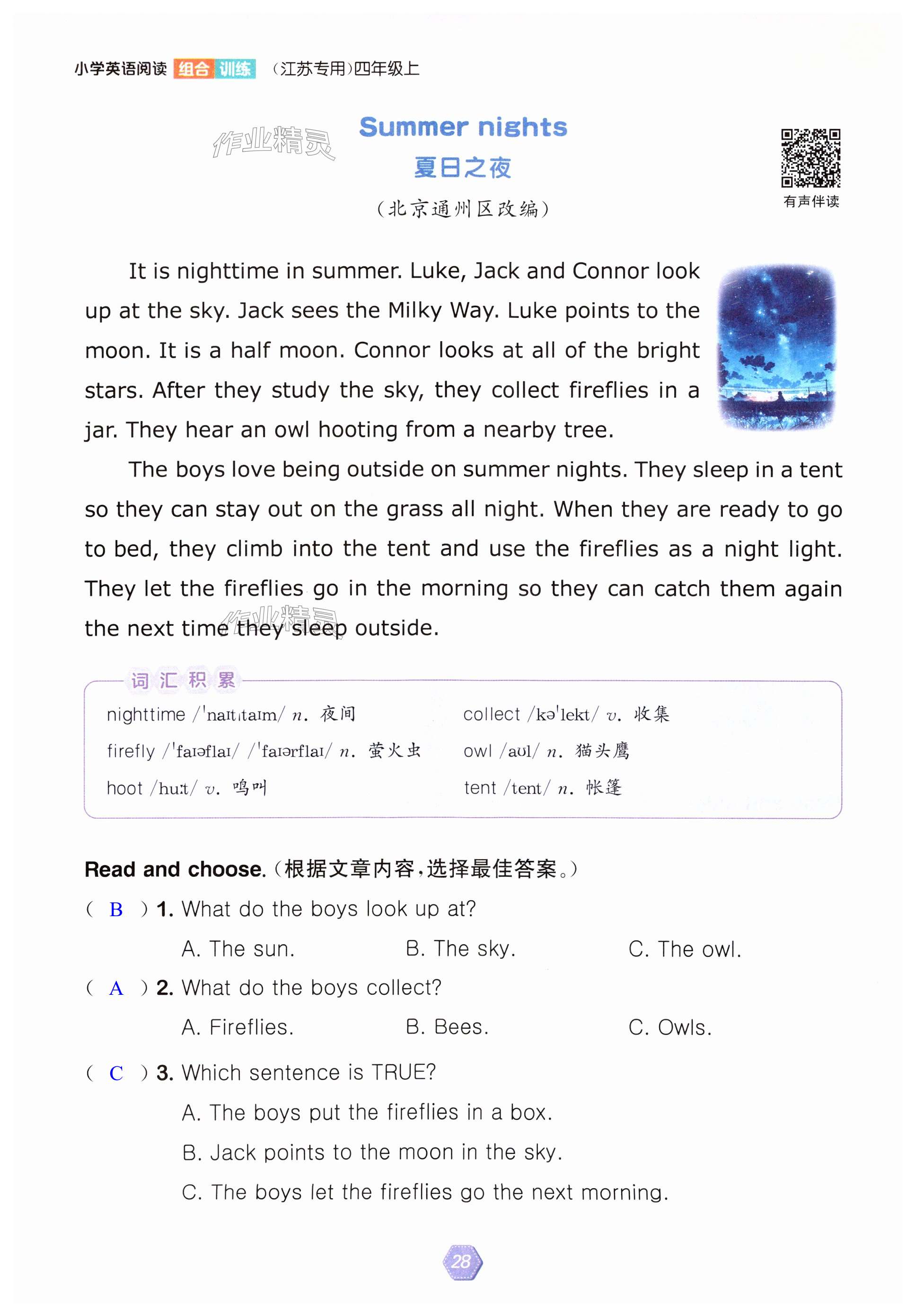 注:目前有些书本章节名称可能整理的还不是很完善,但都是按照顺序排列的,请同学们按照顺序仔细查找。练习册 2024年通城学典组合训练四年级英语上册译林版江苏专版 答案主要是用来给同学们做完题方便对答案用的,请勿直接抄袭。