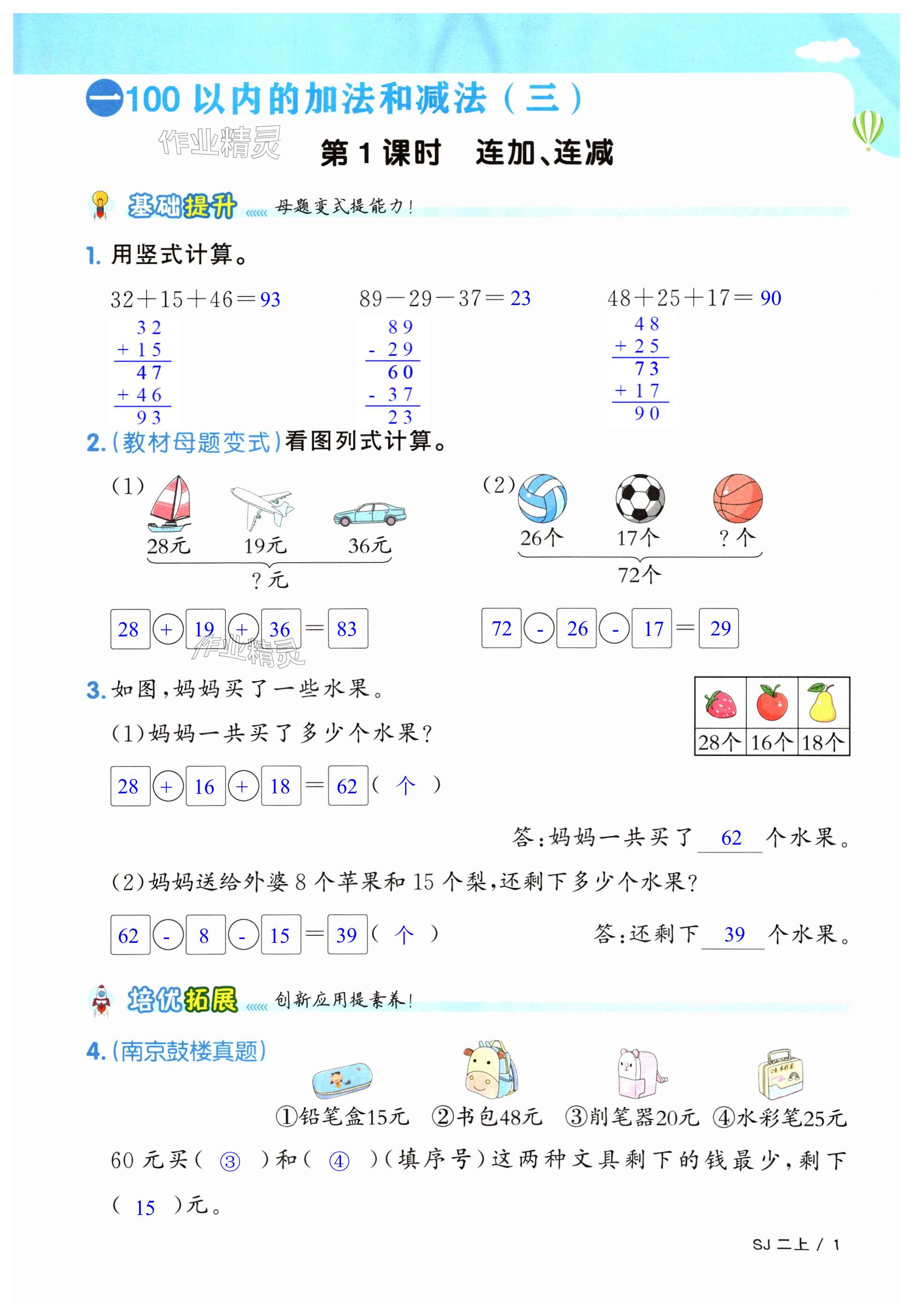注:目前有些书本章节名称可能整理的还不是很完善,但都是按照顺序排列的,请同学们按照顺序仔细查找。练习册2024年阳光同学课时优化作业二年级数学上册苏教版答案主要是用来给同学们做完题方便对答案用的,请勿直接抄袭。
