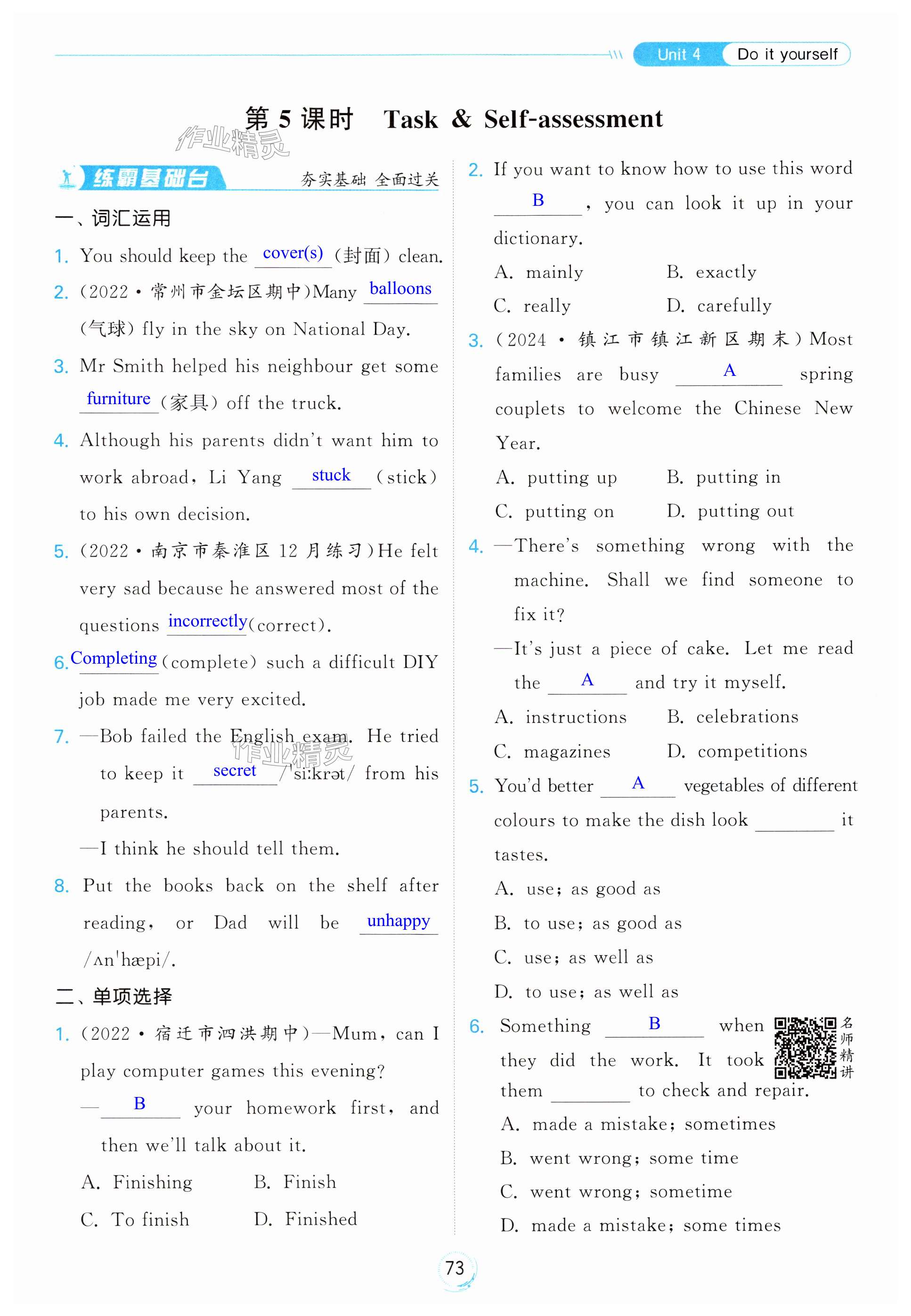 注:目前有些书本章节名称可能整理的还不是很完善,但都是按照顺序排列的,请同学们按照顺序仔细查找。练习册 2024年亮点给力全优练霸八年级英语上册译林版 答案主要是用来给同学们做完题方便对答案用的,请勿直接抄袭。