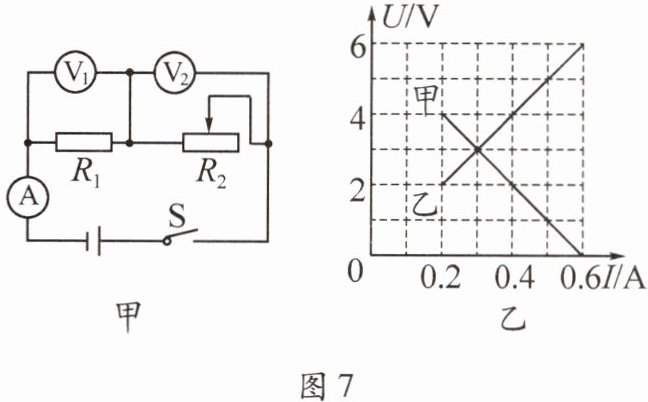 7.如图7甲所示的电路,电源电压保持不变,闭合开关S,在将滑动变阻器连入电路的阻值从最大调节到最小的过程中,两个电阻的U-I关系图象如图7乙所示。下列判断不正确的是(