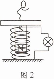 3.(2023·无锡)某幼儿园游乐室里有一块能发电的地板,当小朋友们在上面跳跃时,小灯泡便会一闪一闪发光,地板下方铺设的电路结构如图2所示。当踩踏地板时,固定在地板下方的磁铁往复运动,使固定在地面上的弹簧线圈做切割磁感线运动,闭合电路中产生感应电流,小灯泡发光。在小朋友上下往复运动过程中,线圈中产生的电流的方向是变化(填"变化"或"不变")的。