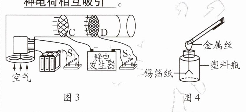 3.图3所示是某科研队伍成功研制出的PM2.5净化器。闭合开关$S_1、$$S_2$后,风扇旋转吸入含有颗粒物的空气,颗粒物通过带有负电荷的光洁金属网C后会带上负电荷,然后被带有正电荷的棉芯D